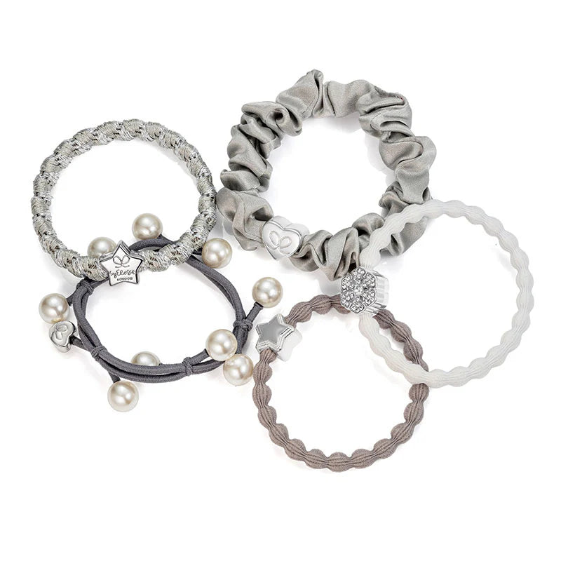 Box Inhalt: Silver Heart Silk Scrunchie Moonlight, Pearl Cluster Storm Grey, Enamel Silver Star Cloudy Grey, Snowflake Snow White, Woven Silver Star Silver Shimmer.