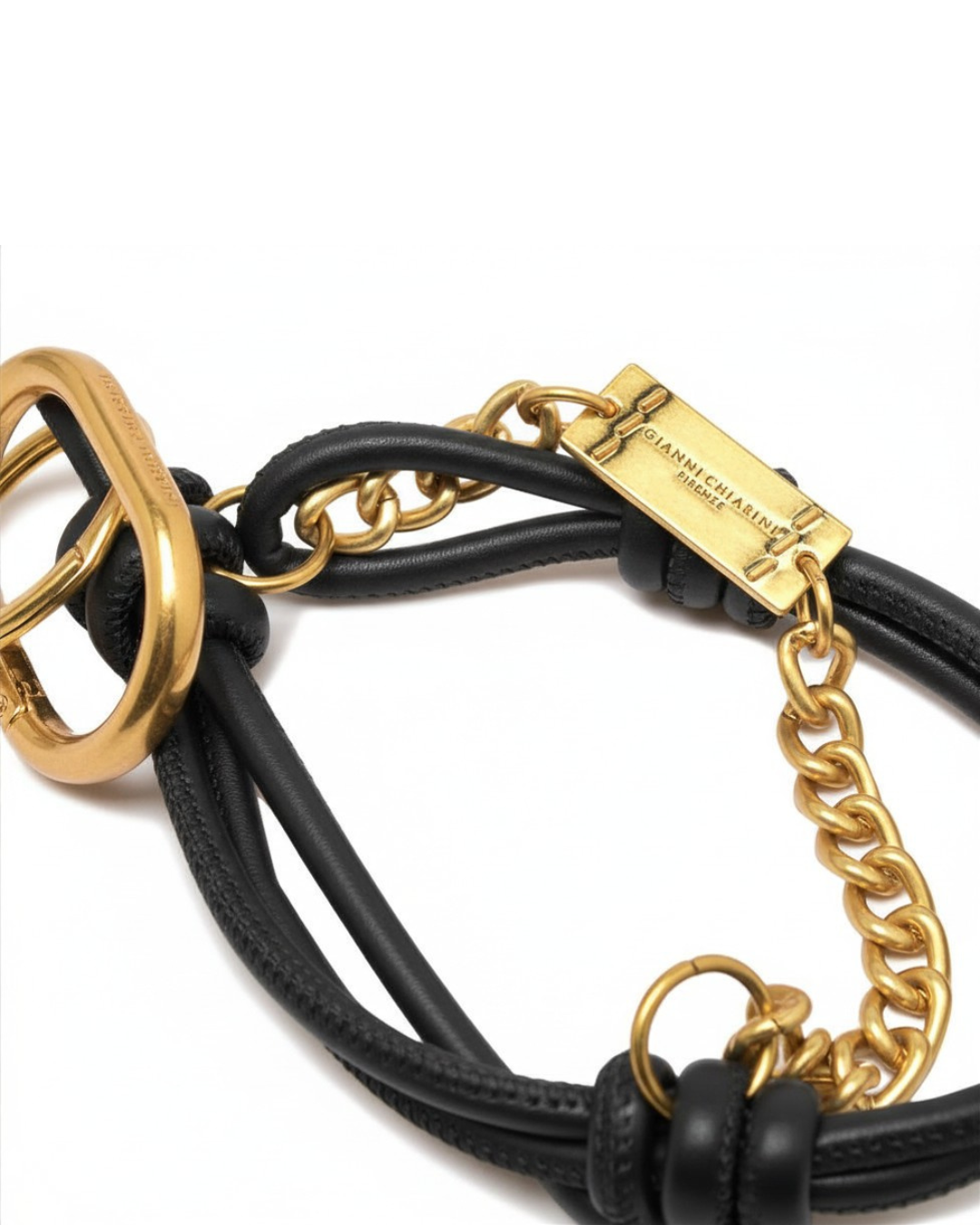 Die Neuheit der Gianni Chiarini Kollektion, der Taschen Anhänger Knotty Chain, vereint zeitgenössisches Design und kreativen Geist. Er ist aus Kunstleder mit dekorativer Verflechtung und einer eleganten goldenen Kette gefertigt und verleiht Taschen und Accessoires eine dynamische und feminine Note.