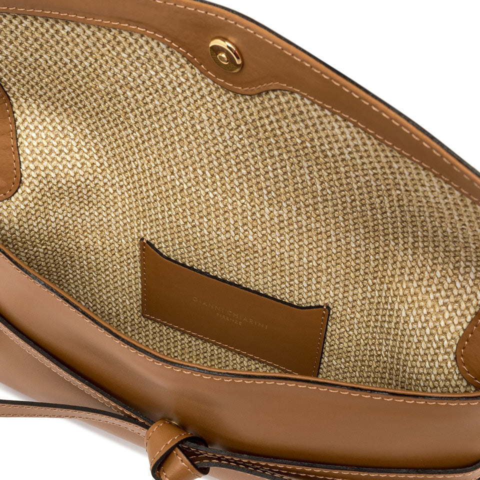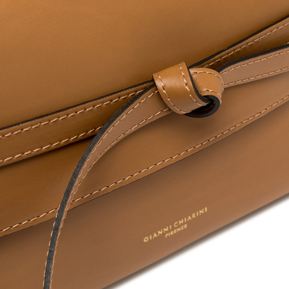Belty ist eine neue Clutch-Bag von Gianni Chiarini Firenze, hergestellt aus Leder und mit Lederdetails verziert. Das charakteristische Detail ist der Riemen, der die Tasche wie ein Gürtel umschließt und auf der Vorderseite einen eleganten Zierknoten bildet. Mit ihrem abnehmbaren Trageriemen ist sie auch perfekt zum tragen als Crossbody-Tasche geeignet. Farbe Cuoio -ein Gognac Ton.