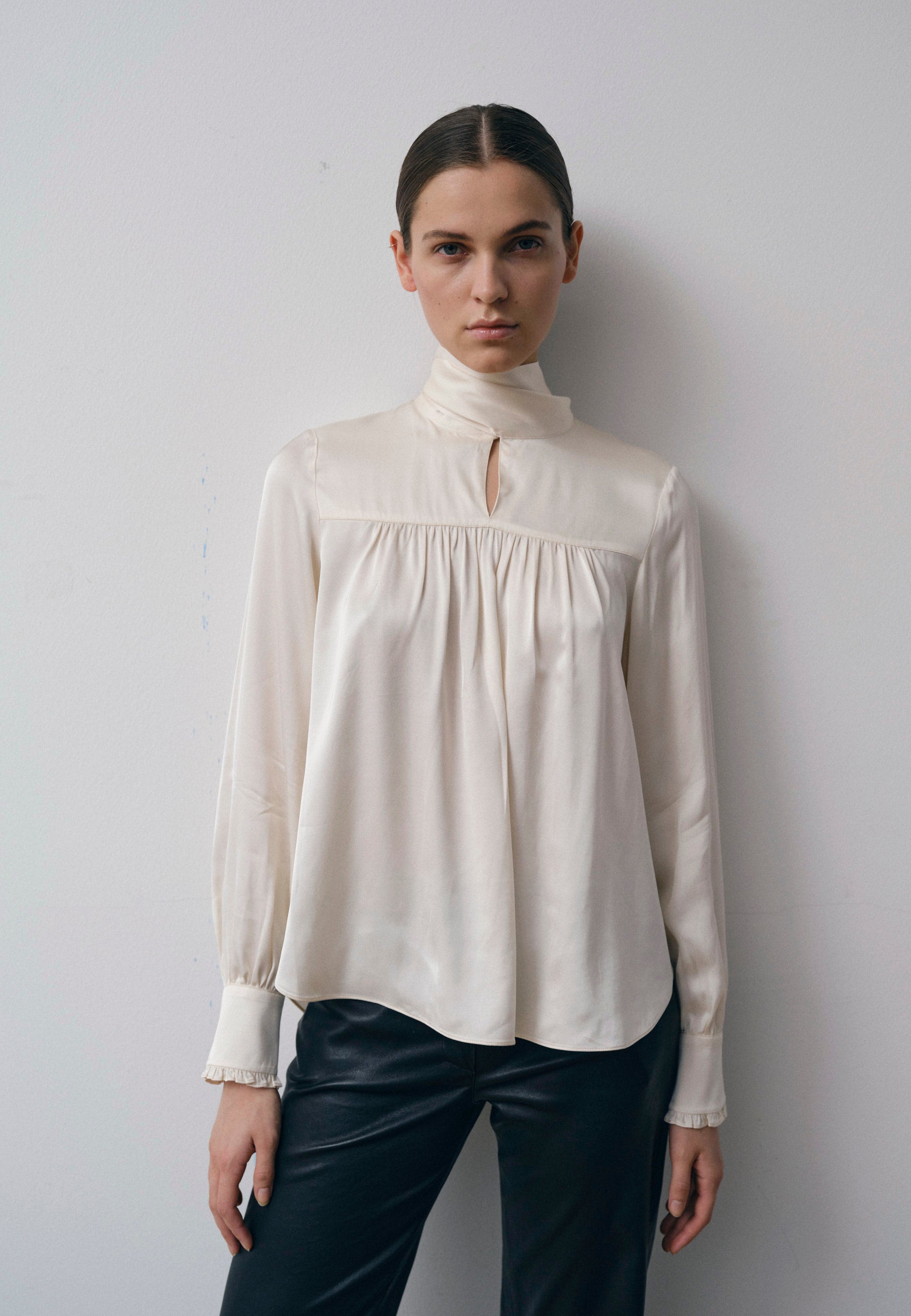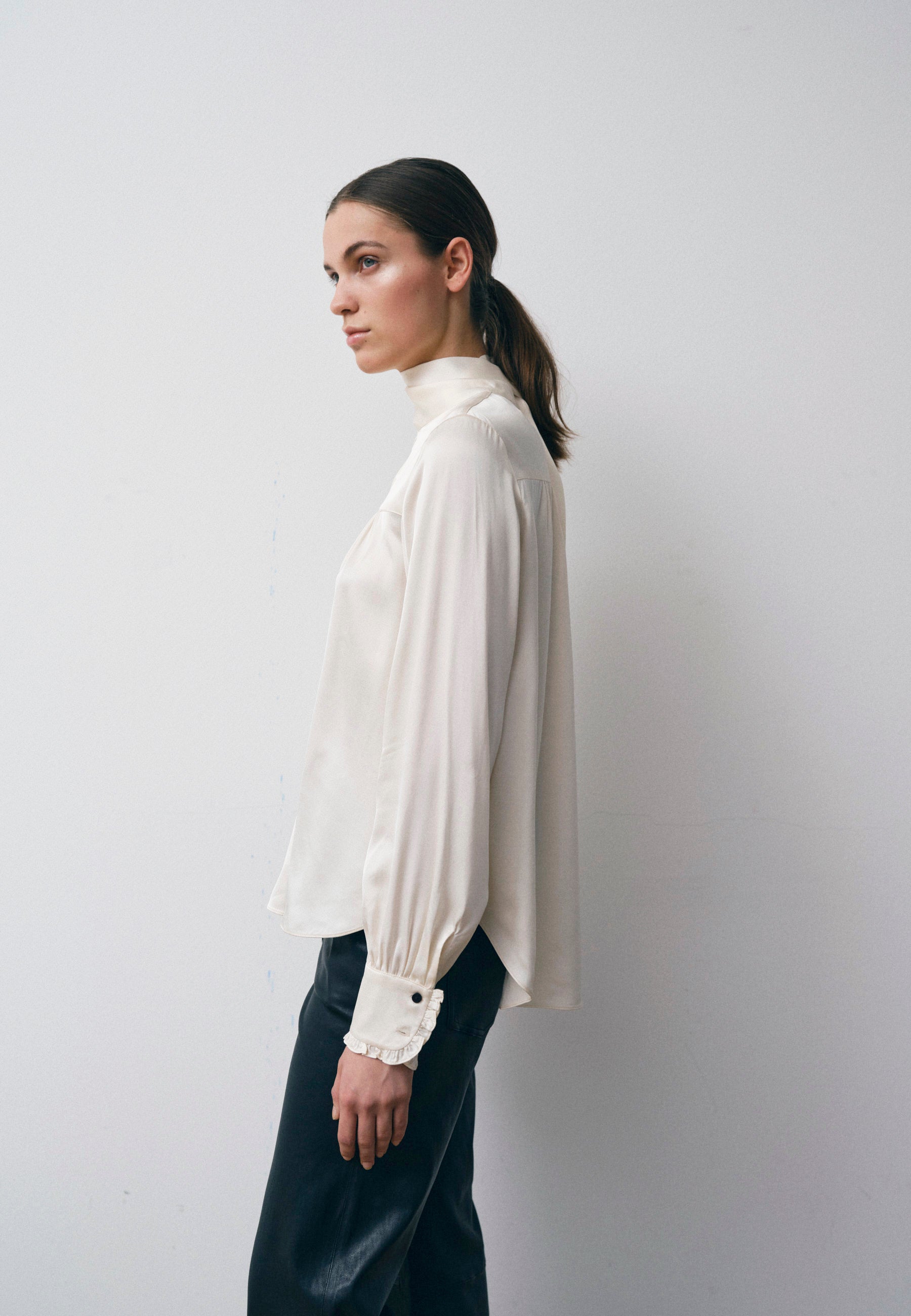 Bluse Alba in fließender Viskose/ Rayon Qualität. Farbe Creme-Weiß, edler Glanz in der Qualität. An den Manschetten kleine Raffungdetails. Vorne und hinten kleiner Schlitz am Ausschnitt. Stehkragen endet in zwei breiteren Bändern, die hinten zusammengebunden werden können.