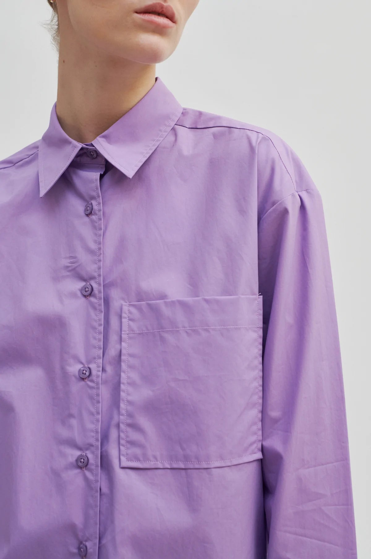 Klassisch geschnittene Bluse / Hemd in toller Farbe Lila. Lange Ärmel mit Manschetten, die Bluse ist vorne durchgeknöpft. Aus 100% Organic Cotton.