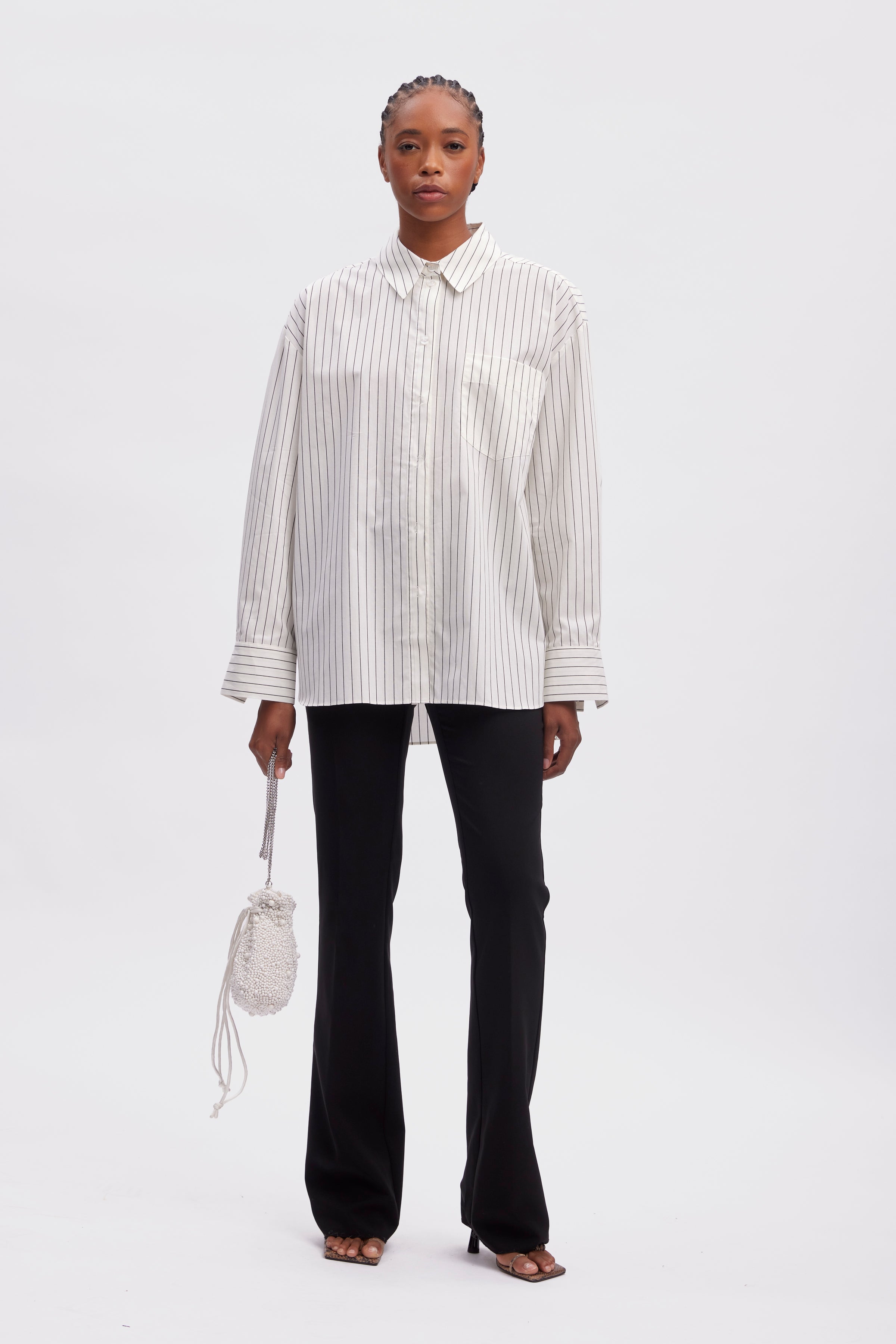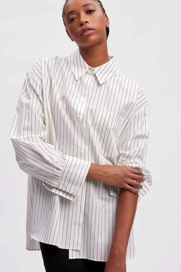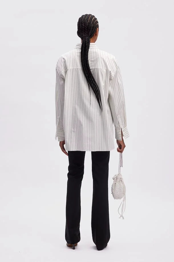 Nadelstreifen Hemdbluse von Gestuz in Farbe Creme / Schwarz. Das Hemd hat eine Das Hemd hat eine Oversized Form. Das Hemd ist durchgeknöpft und ist versehen mit einer Brusttasche.
