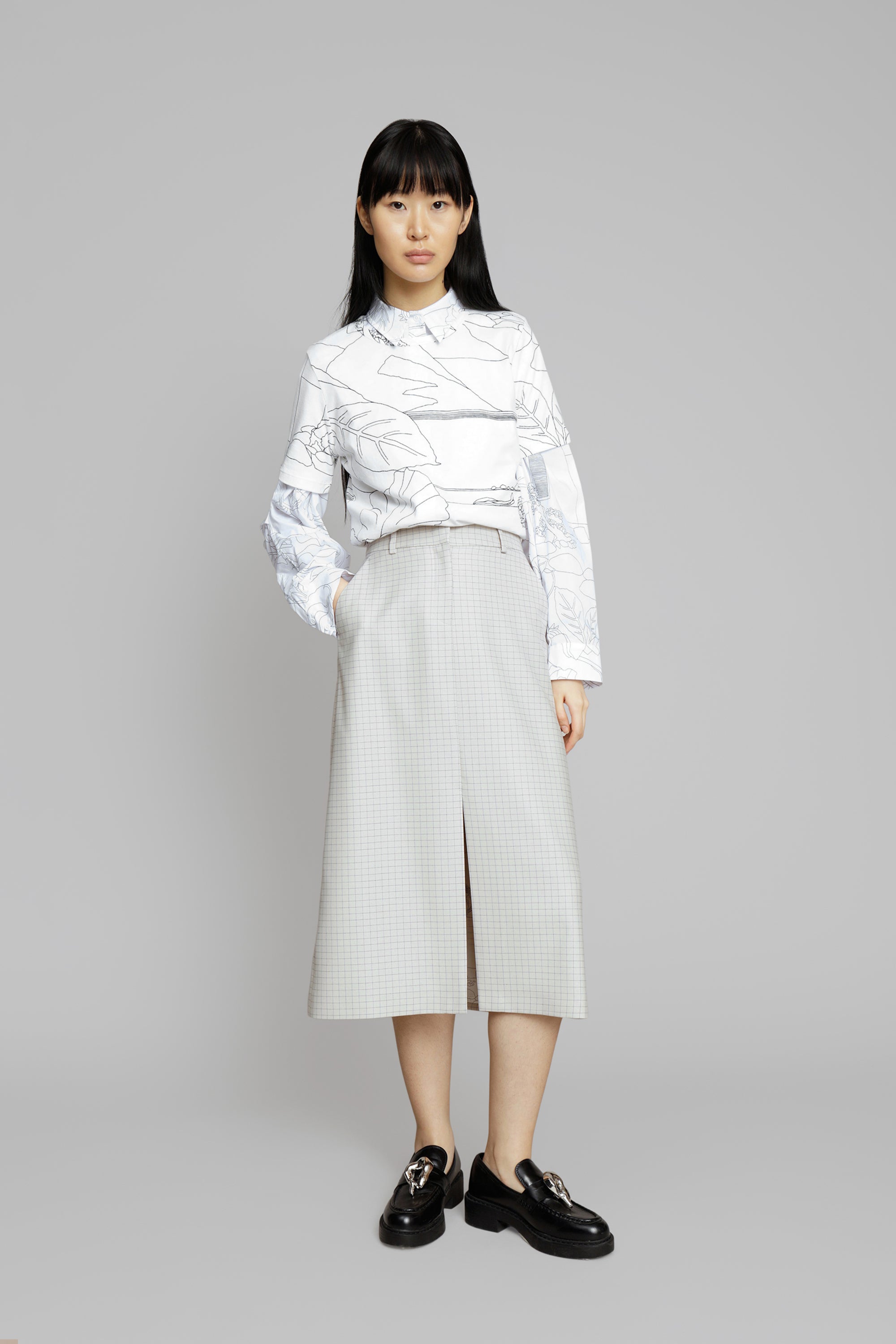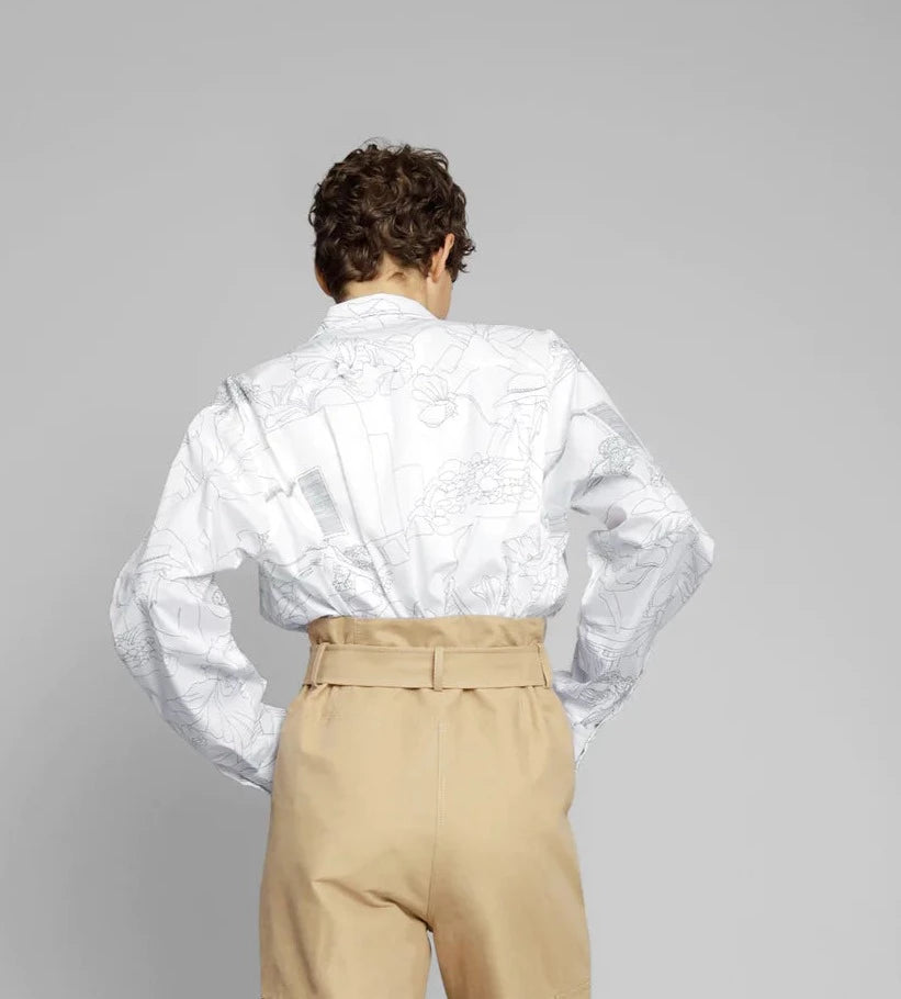 Hemdbluse Earl mit langen Ärmeln und Kragen. Vorne komplett durchgeknöpft. Das Hemd ist hinten etwas länger geschnitten. Oversize Passform. Im Schönen Outline Druck, welcher Umrisse der Blumen zeigt.
