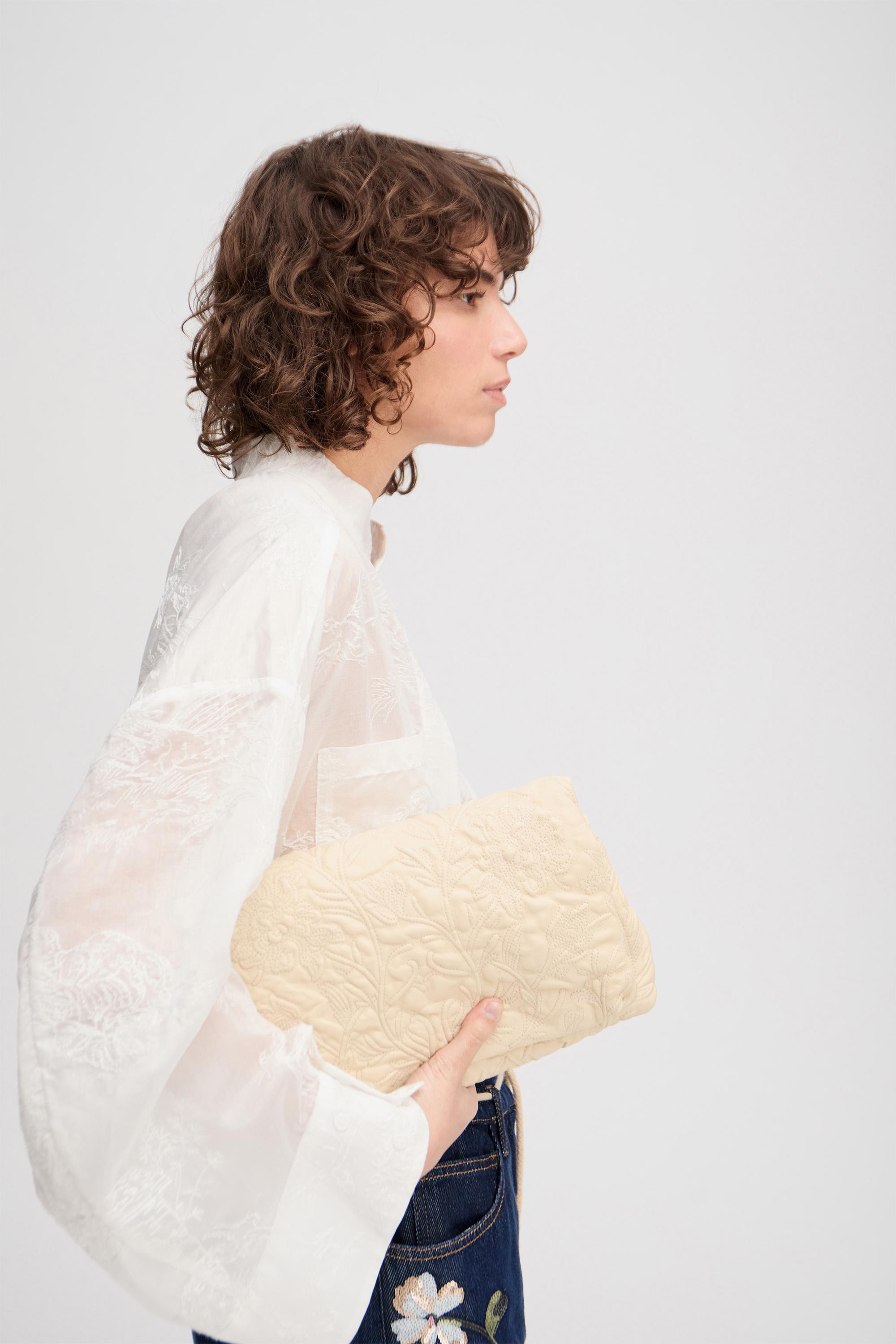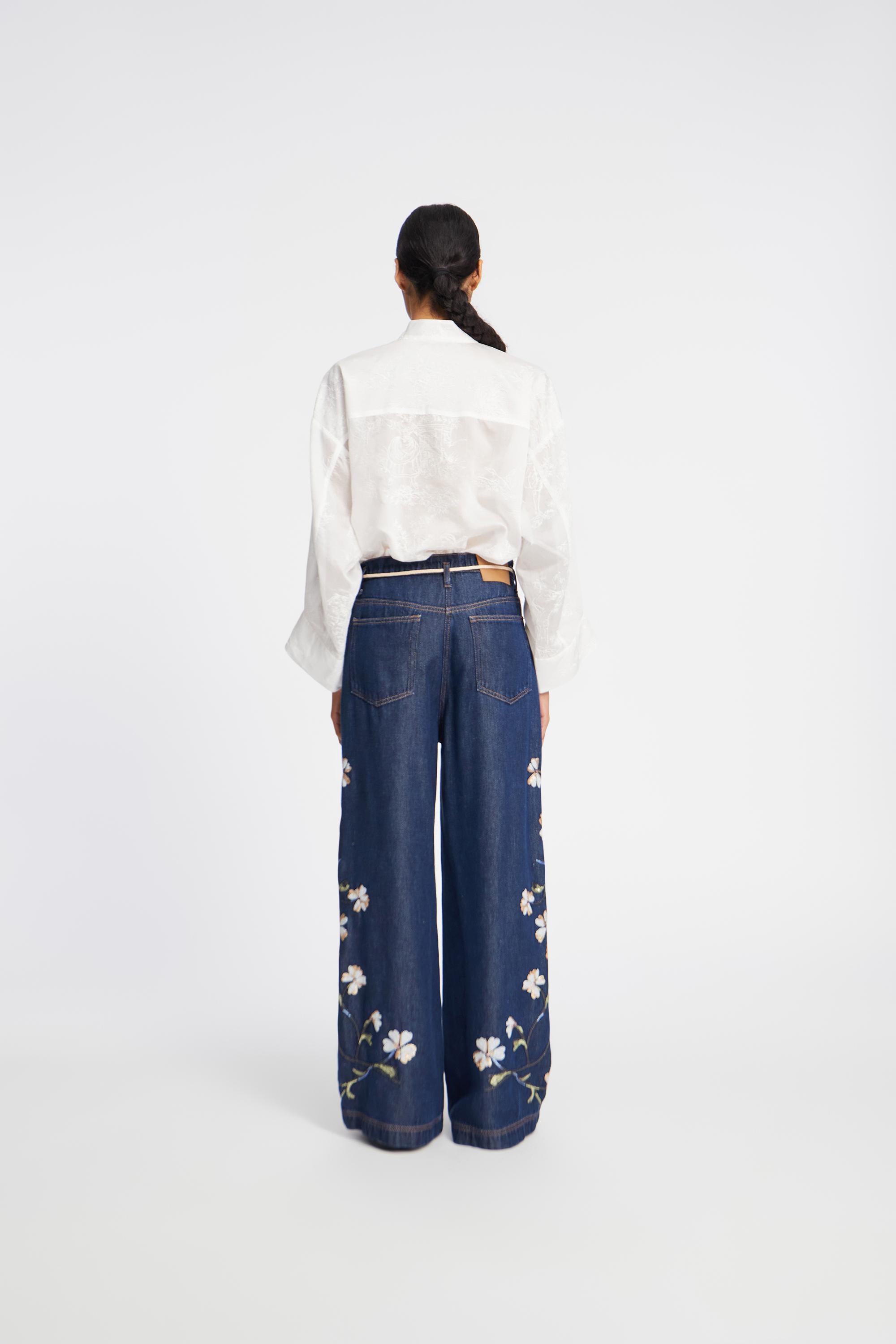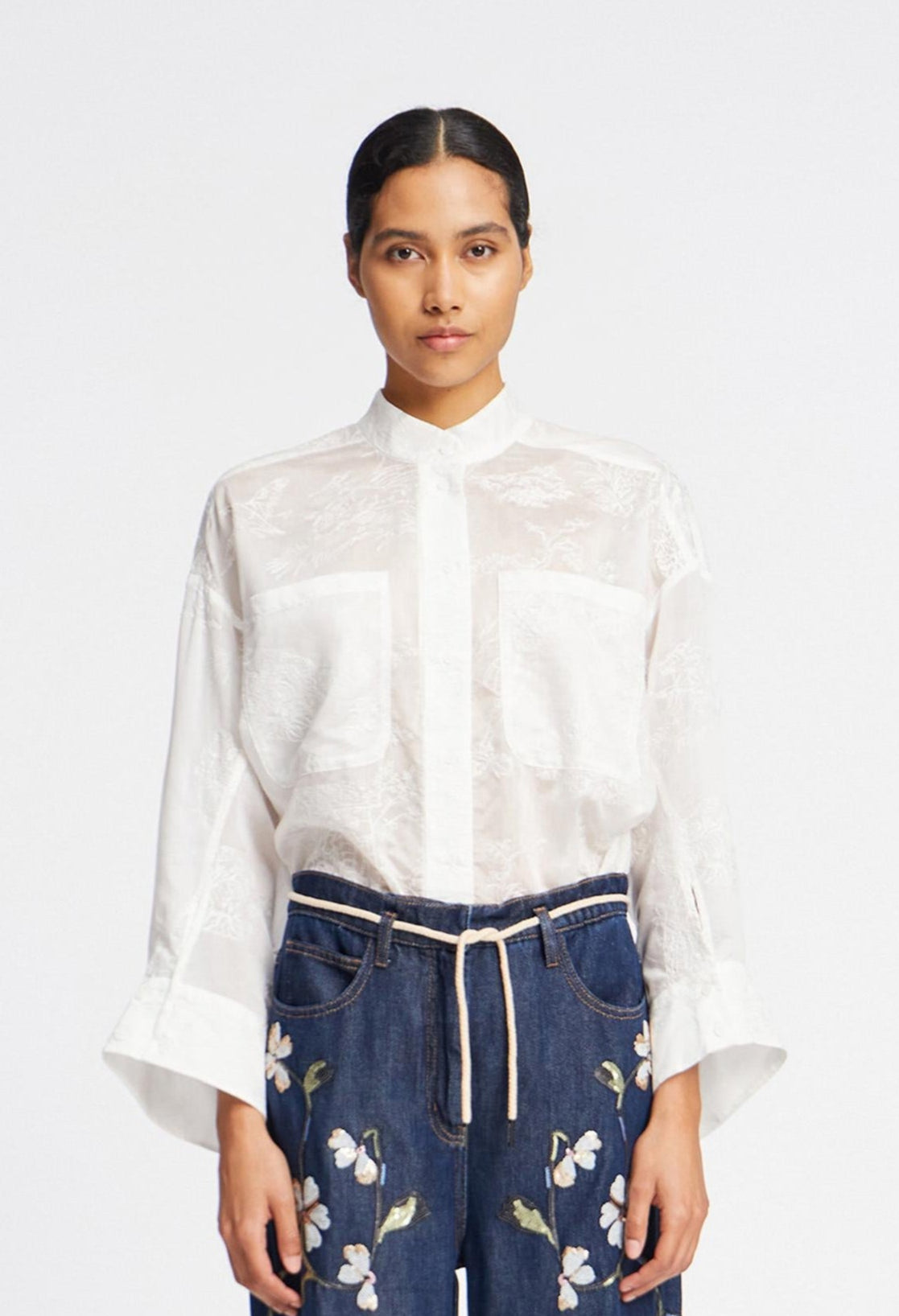 Hemd mit einer bestickten Qualität, mit nostalgischen Motiv-Elementen. Dieses Hemd ist halbtransparent gestaltet und verfügt über zwei leicht übergroße Brusttaschen, wunderschöne breite Manschetten und einen eleganten Stehkragen, der sich leicht umlegen lässt. Das Hemd hat einen Knopfverschluss und ist im Oversize-Stil designt.