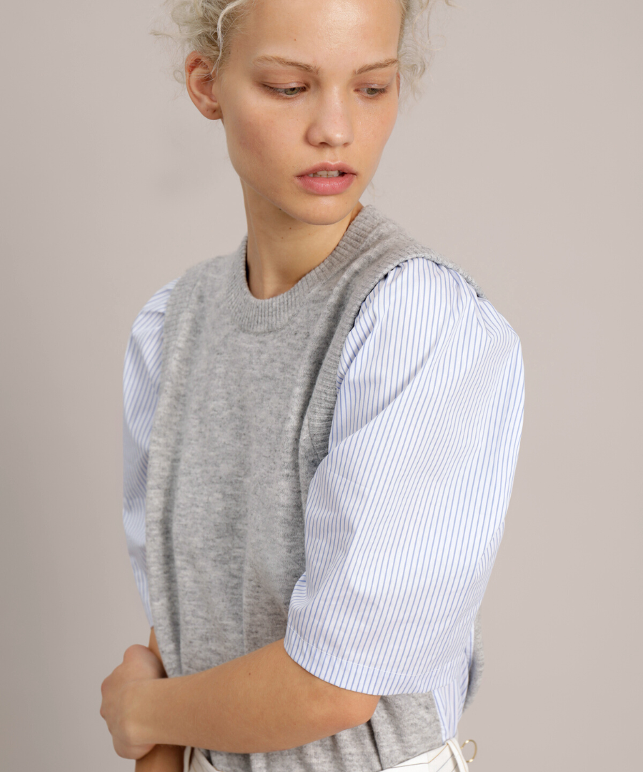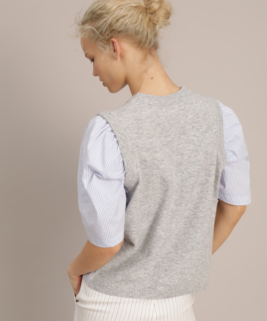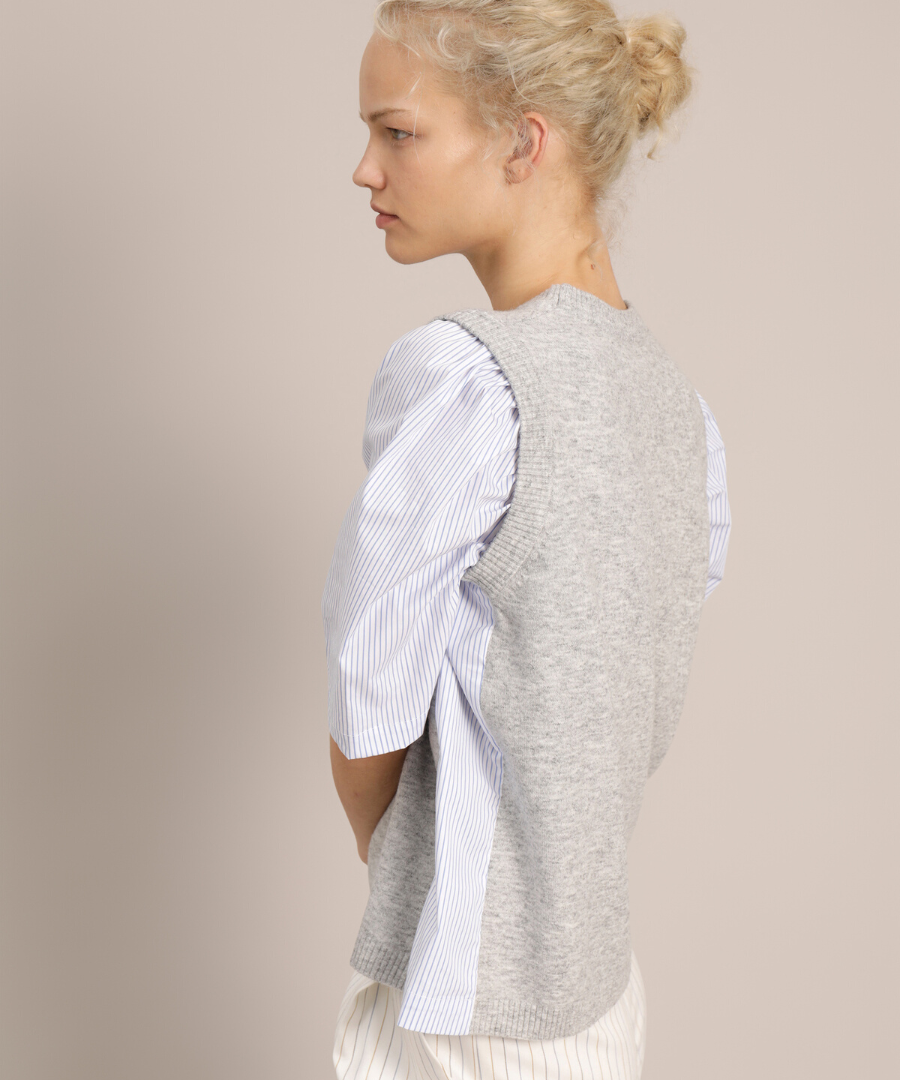 Two in One Optik. Strick Oberteil Jenna vereint zwei Teile in einem. Grauer Melange Strick im Vorder- und Rückteil, Ärmel und Seiteneinsätze sind dagegen im Blusen Blau gestreift Popeline Qualität.