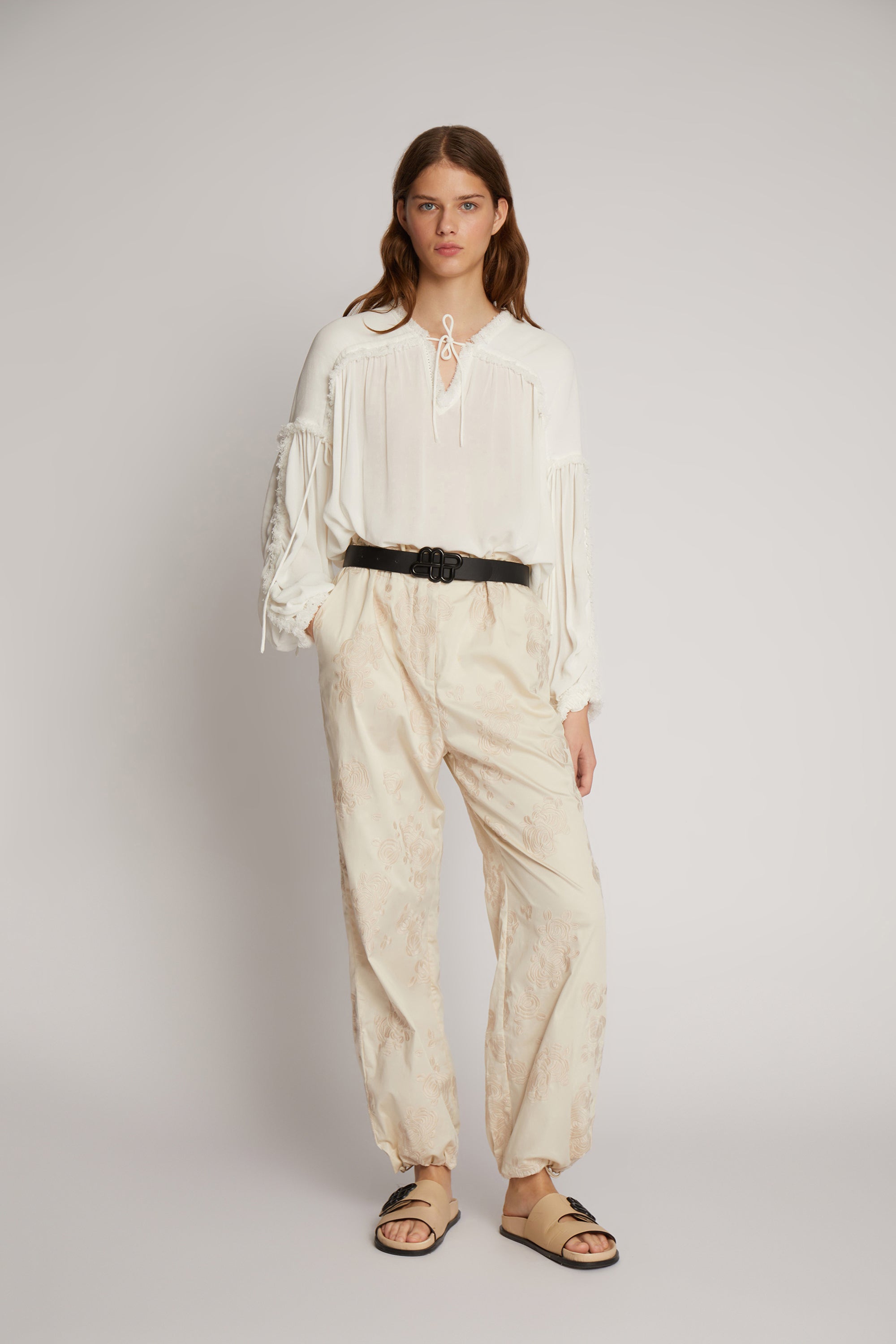 Feminine Bluse mit schönen Rüschendetails an den Ärmeln, der Brust und dem Rücken. Das Shirt hat eine lockere luftige Passform, lange Ärmel und einen V-Ausschnitt mit einem eleganten Bändchenverschluss zum Knoten. Leichte Viskose Chiffon Qualität.  Erhältlich in der Farbe Schwarz oder Weiß.