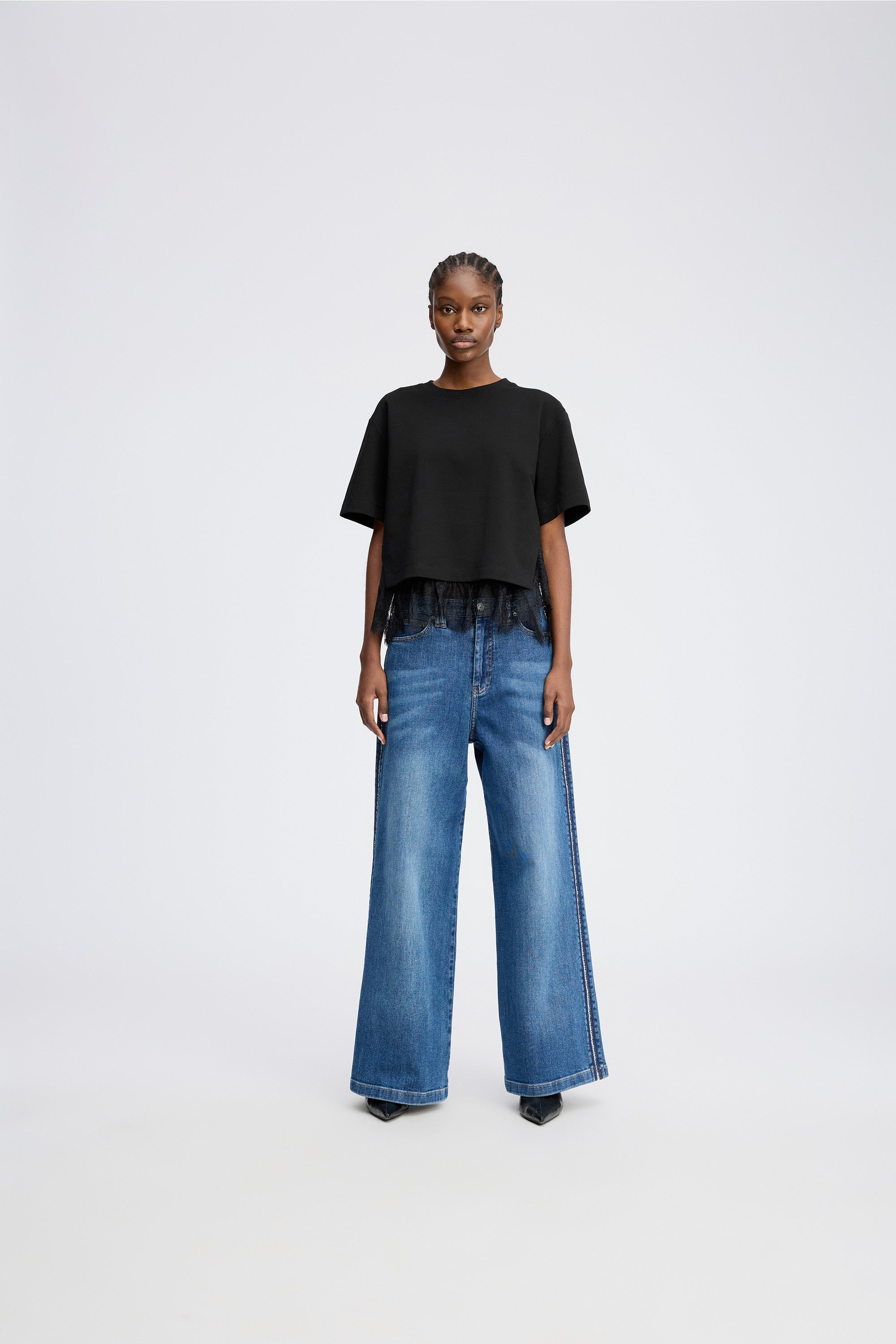 Das T-Shirt bestehend aus zwei schönen Teilen: Ein klassisches, kurzes T-Shirt und ein elegantes Spitzentop, die im Layering-Look kombiniert oder einzeln getragen werden können. Das T-Shirt ist mit seitlichen Schlitzen gestaltet. In Farbe schwarz.