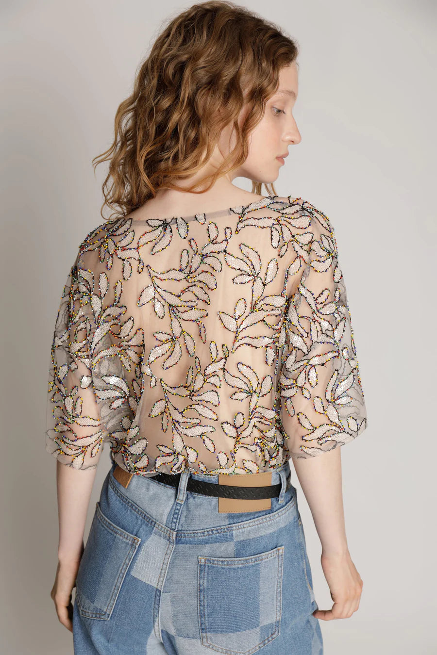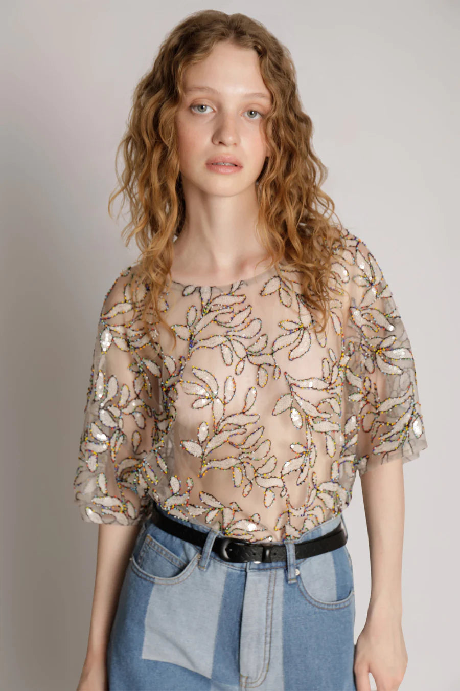 Trend Piece! Eine wunderschöne perlenbesetzte, durchsichtige Bluse mit ellenbogenlangen Ärmeln von Munthe. Die Bluse ist mit einem Rundhalsausschnitt und einer lockeren Passform gestaltet. Kombiniere das Oberteil zum Tanktop, über ein T-Shirt oder Bluse. Toll als Kombi zur Jeans oder zu einer weiten Hose.