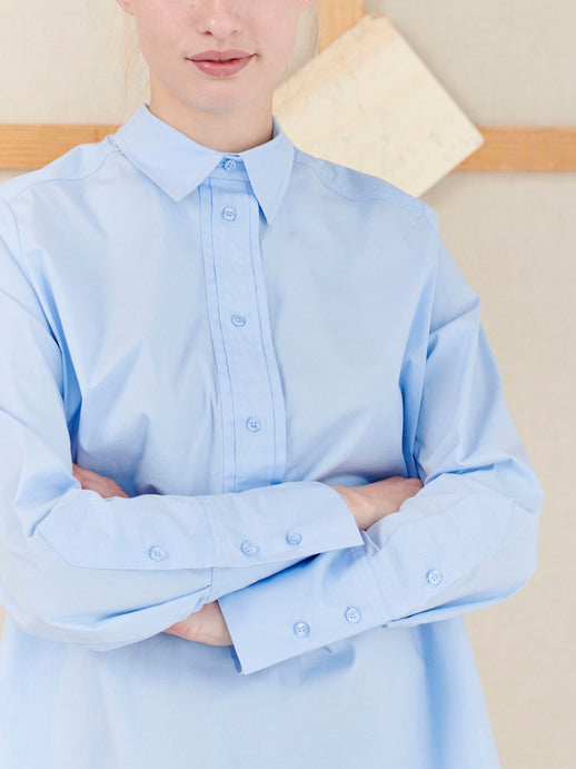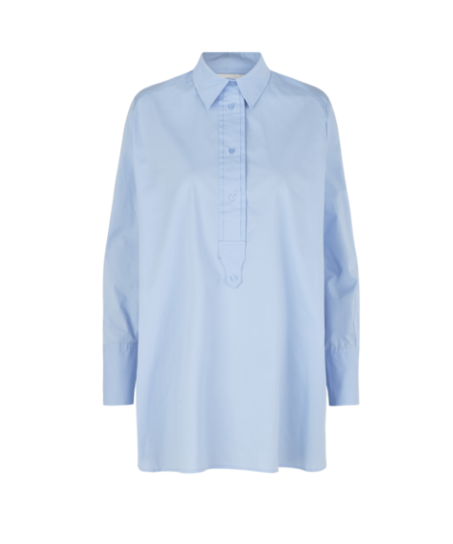 Blaue Hemdbluse Nactarino von Munthe. Dieses oversized Hemd hat breite Manschetten am Arm und eine dekorativen Knopfleiste am Ausschnitt. Qualität organic cotton. Blusenhemd ist hinten etwas länger als vorne. Aufgrund der oversized Form kann die Bluse je nach gewünschter Optik ( Weite) eine Nummer kleiner bestellt werden.