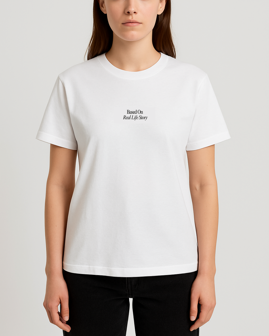 Ein Basic T-shirt aus der leichten Bio-Baumwoll-Qualität. Das T-Shirt hat einen Rundhalsausschnitt und kurze Ärmel. Vorne ist das T-Shirt bedruckt mit dem Text " Based On Real Life Story". Druck ist in Farbe Schwarz.