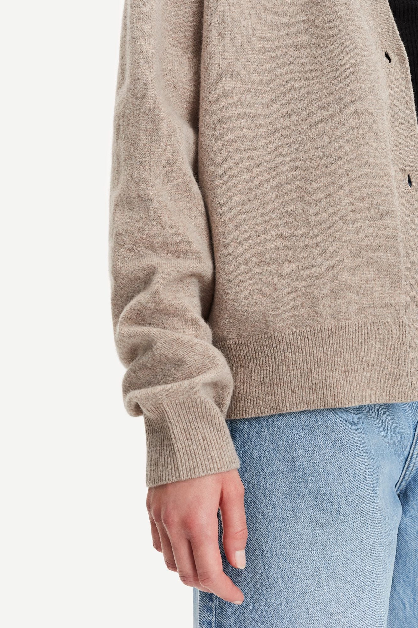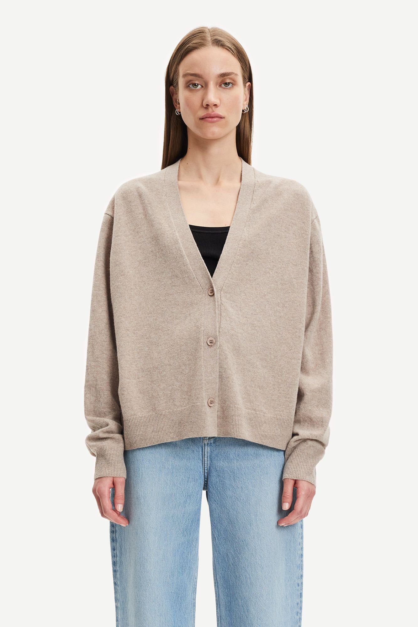 Dieser Strick Cadigan im Box Fit vom dänischen Brand Samsoe Samsoe. Mit Tiefen V-Neck Ausschnitt und mit Knöpfen zu Schließen. Dieser Artikel ist nachhaltig, das Garn ist Wolle, RWS zertifiziert.
