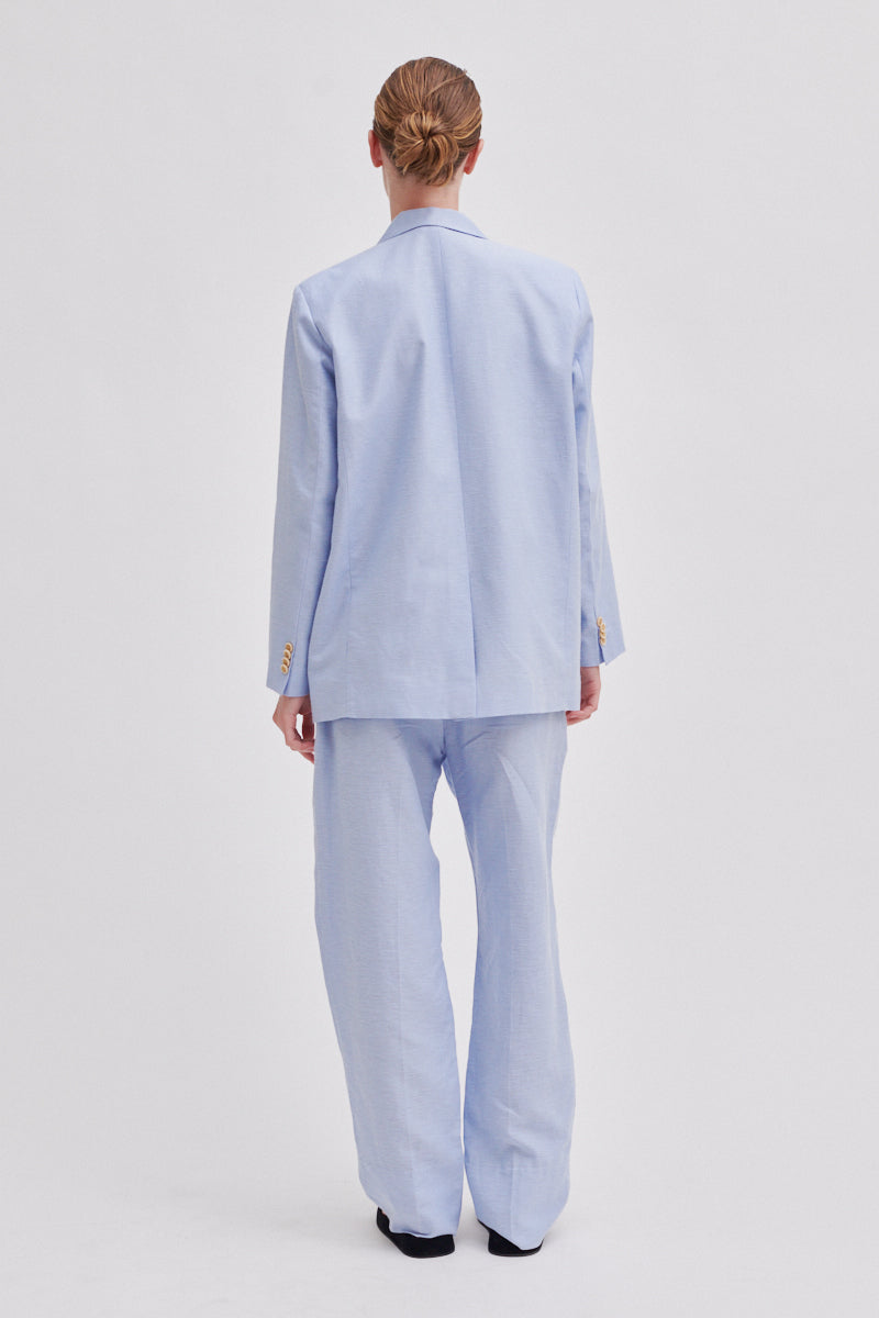 Hose Liah in hellblau aus der sommerlichen Leinen-Viskose Qualität. Passend zu dem Blazer Liah, kann sehr stylisch als ein Sommeranzug getragen werden oder auch einzeln ein echter Hingucker zu einem Tanktop oder Bluse. Die Hose ist lang, hat einen geraden Schnitt und seitliche Eingriffstaschen.