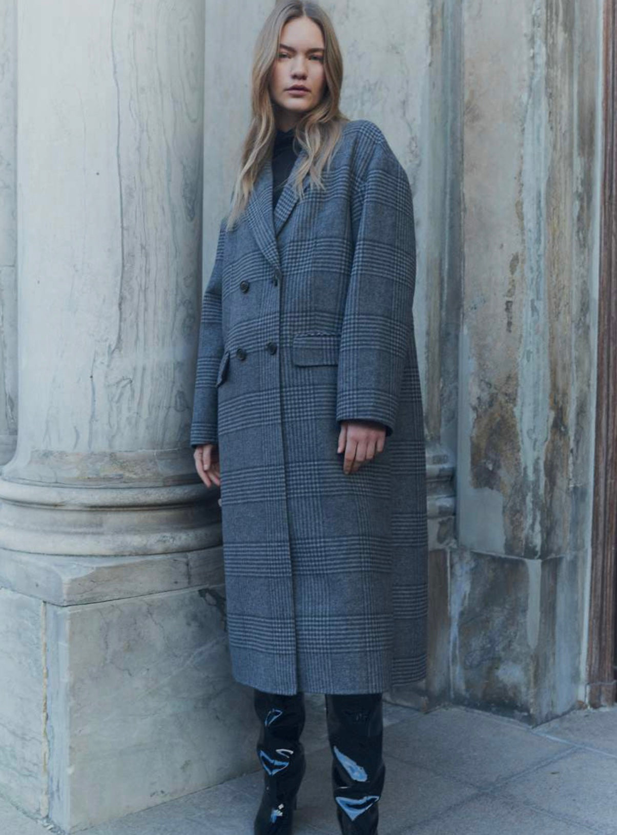 Leichter ungefütterter Mantel Doris aus einer Doubleface Qualität. Innen ist die Ware in einem Anthrazit Grau gehalten und außen den angesagten Glencheck Muster. Revers, Doppelreiher und Pattentaschen geben dem Mantel die moderne Tailoring Optik. Der Mantel hat lange Ärmel, die man ohne weiteres umkrempeln kann und hat einen Schlitz hinten. Aufwändige Innenverarbeitung, da alle Nähte und mit pipings umfasst sind.