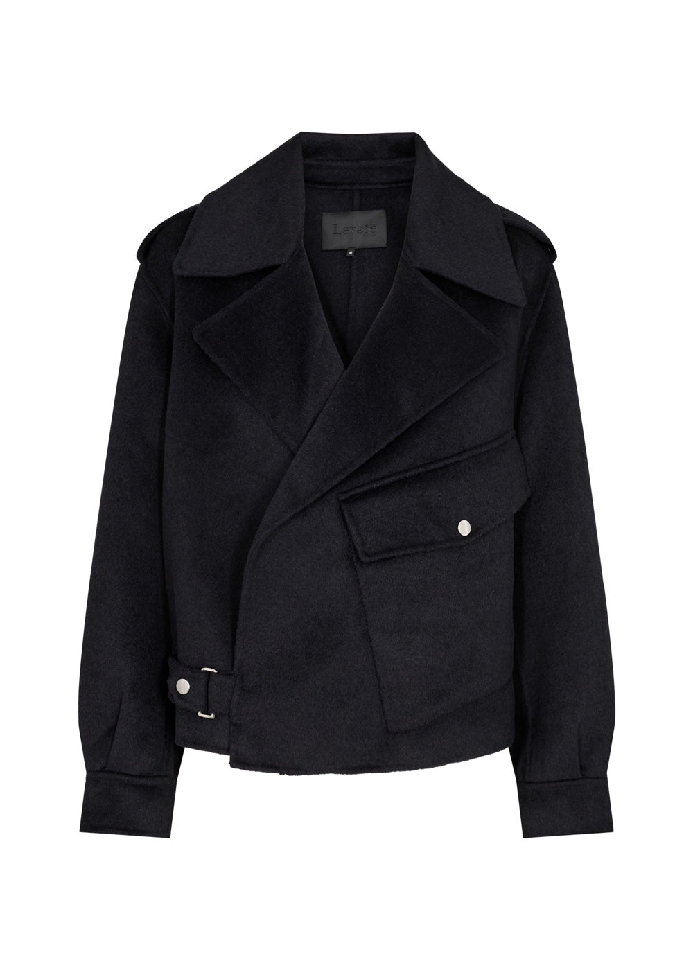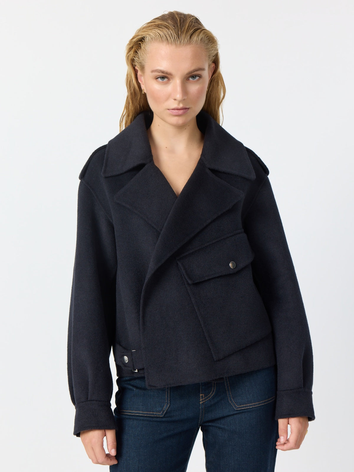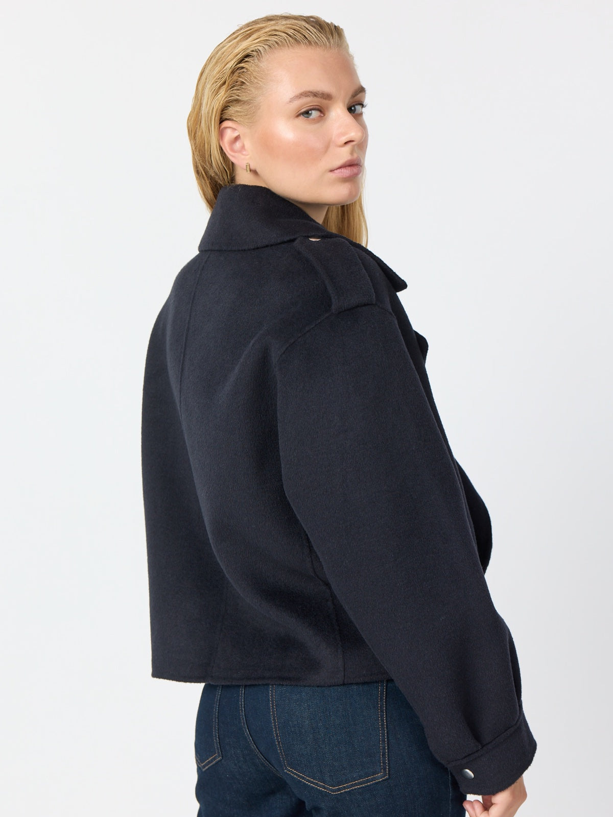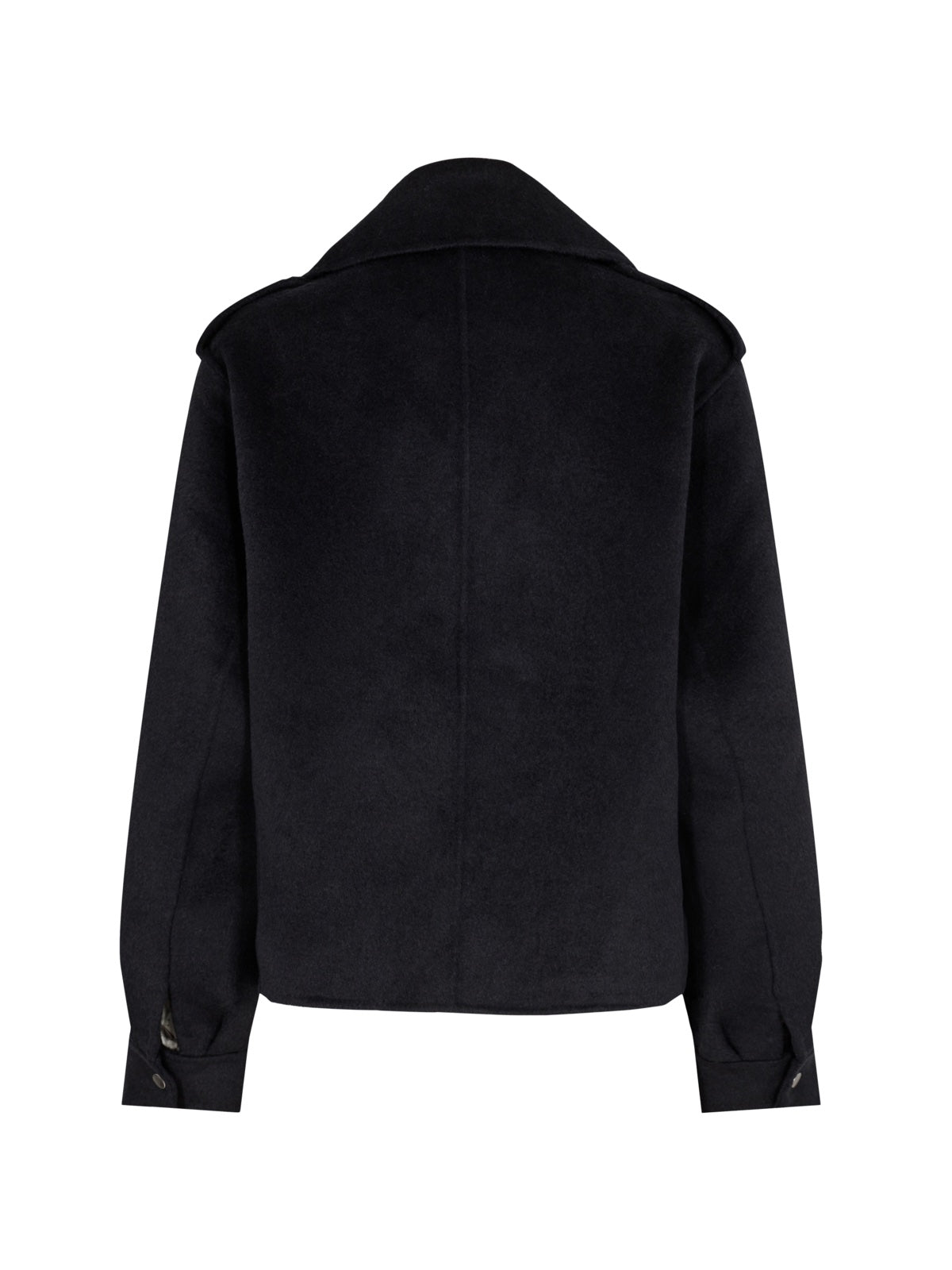 Kurze Jacke im Biker-Stil aus einer leichten Wolle/Viskose Qualität. Perfekt für die Übergangszeit als warmer Blazer Ersatz im Herbst oder Frühjahr. Die Jacke hat einige modische Details, wie großer Kragen, Schulterklappen, eine diagonal aufgesetzte Tasche und Metall Accessoires wie Druckknöpfe.  Kann Lässig offen aber auch geschlossen getragen werden. Jacke ist nicht gefüttert.  Rücken Länge in Gr. S  58 cm