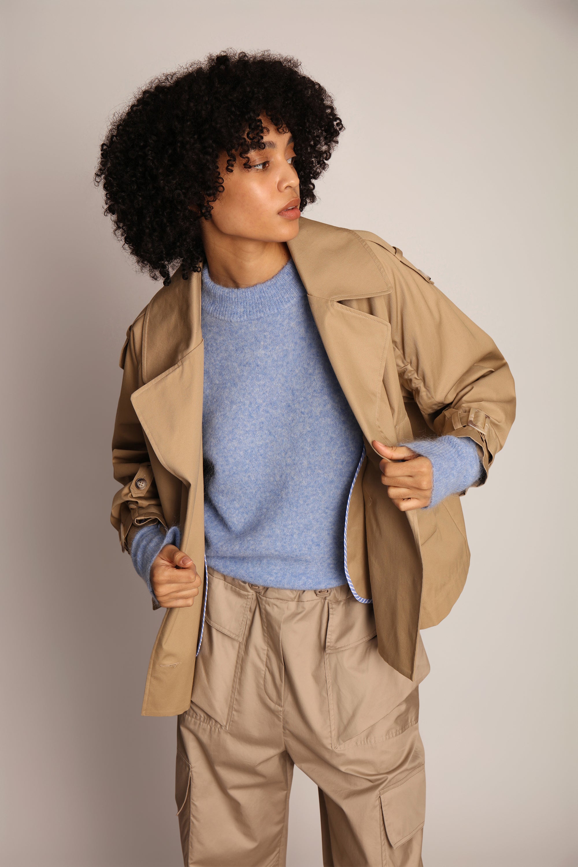 Kurzer Trenchcoat in einer modernen Länge von Munthe, einem Premium Label aus Kopenhagen. Die Trenchcoat Jacke hat klassische, eleganten Details wie Schulterklappen und Ärmelriemen. Die Jacke ist mit Taschen versehen, hat eine lockere Passform und ist aus 100 % Baumwolle gefertigt. Erhältlich in der Farbe Camel.