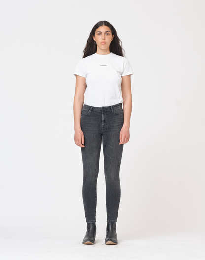 Jeans Bowie vom für den Nachhaltigkeitspreis nominierten Label Tomorrow. Die Jeans hat eine dunkle, schwarze Waschung in used Optik. Schmale Passform. Verkürzte Länge, so dass man die Hose perfekt zu Boots oder Senker tragen kann. Skinny Fit und High Waist.
