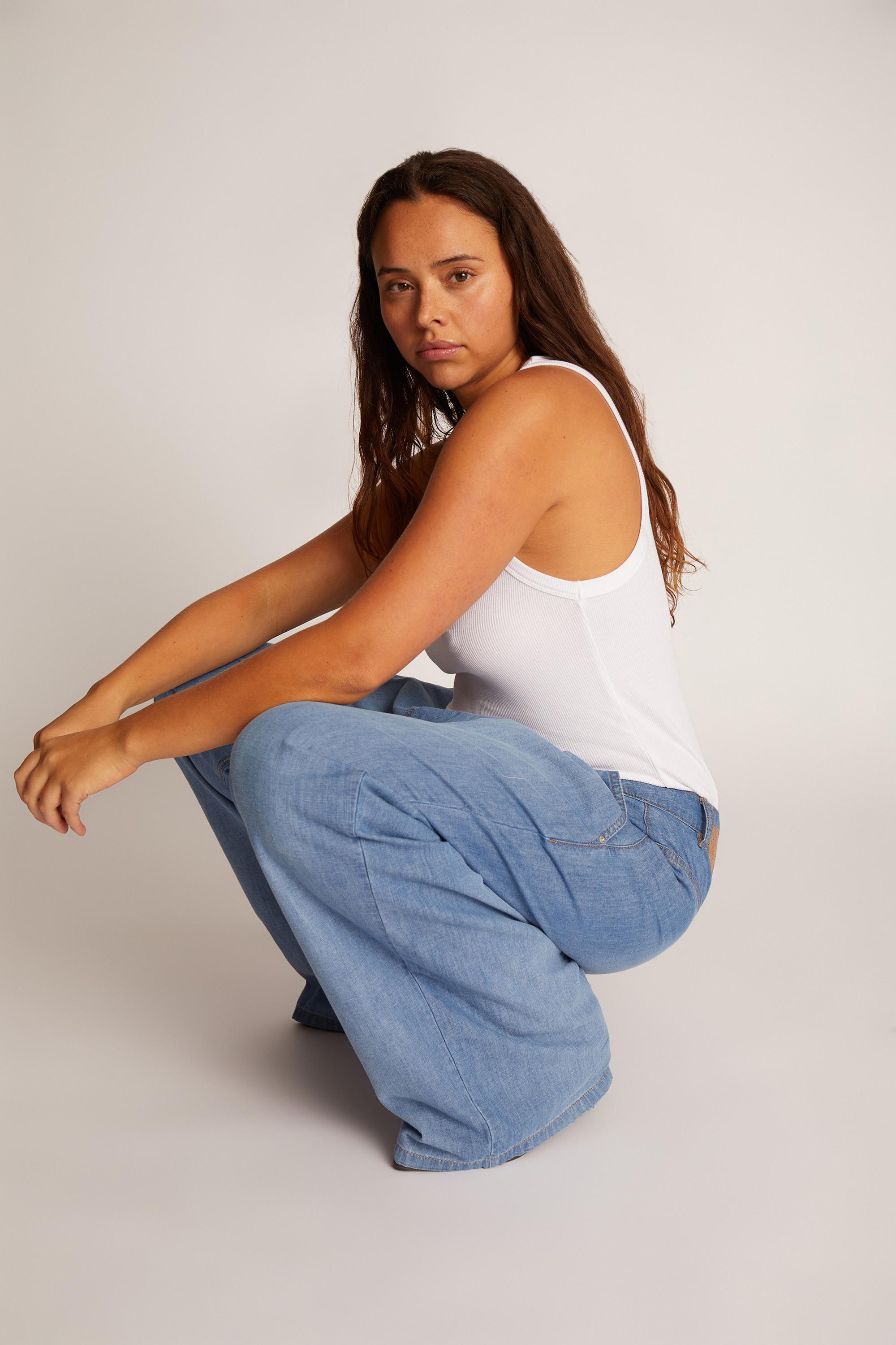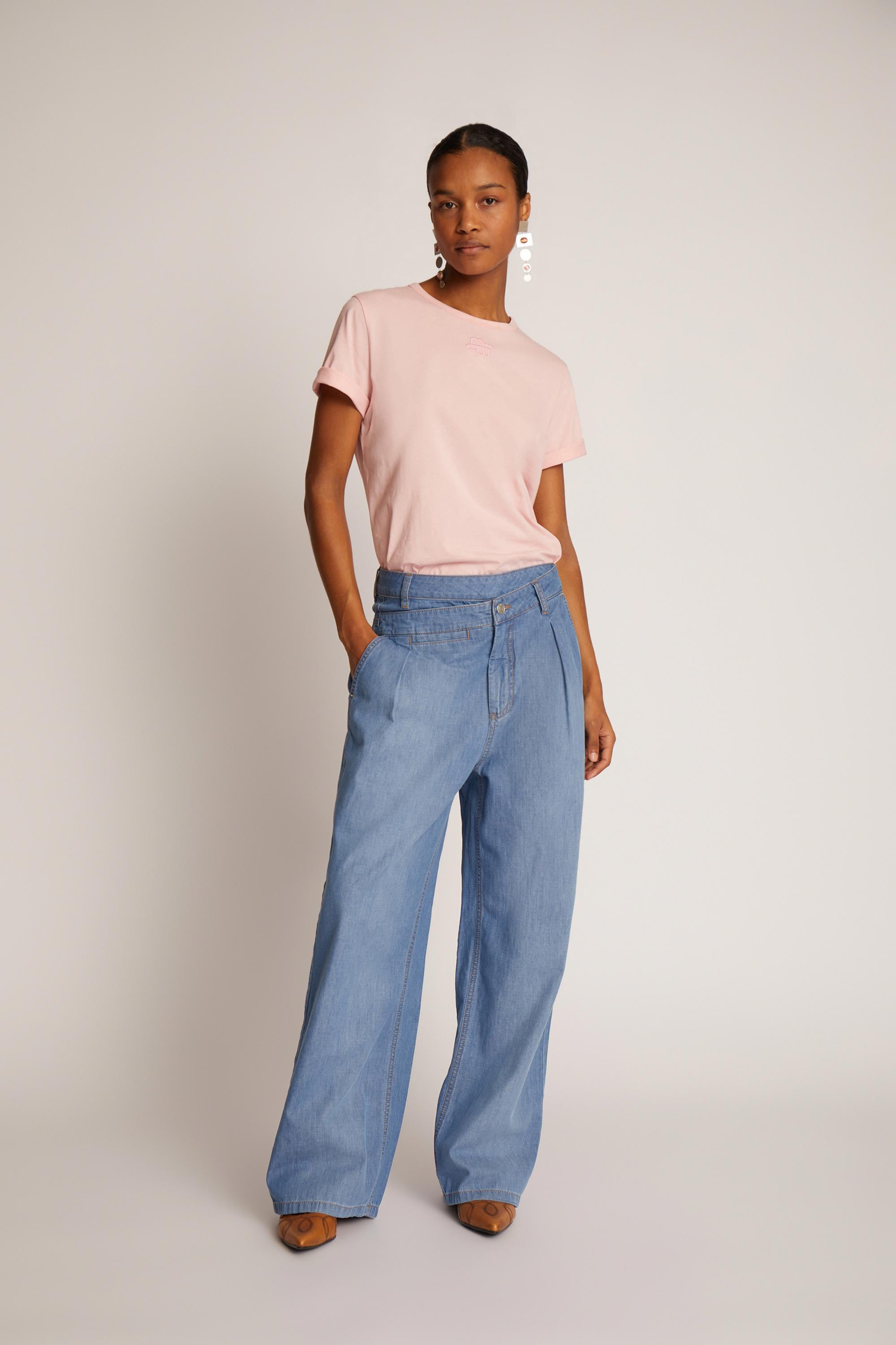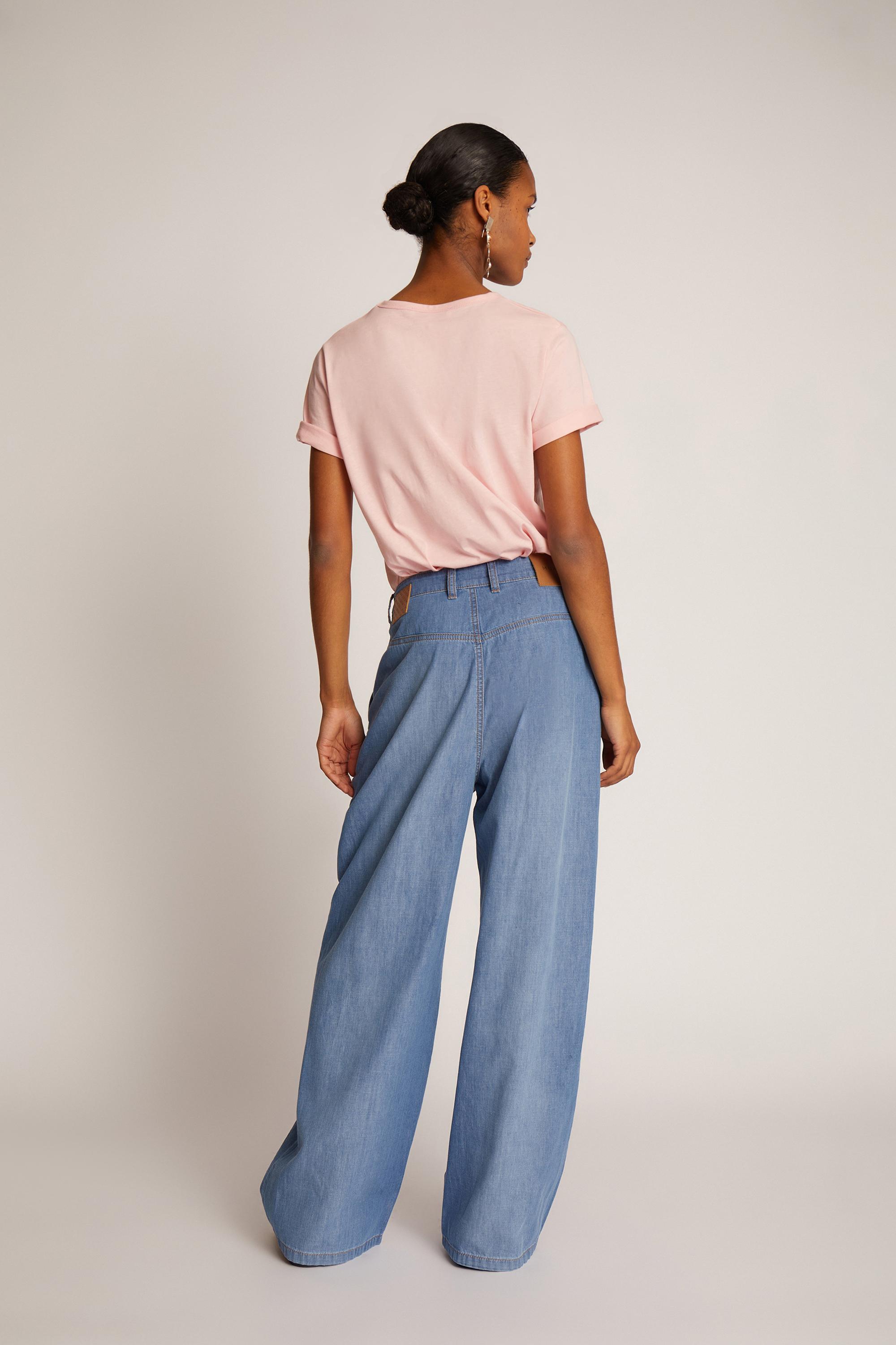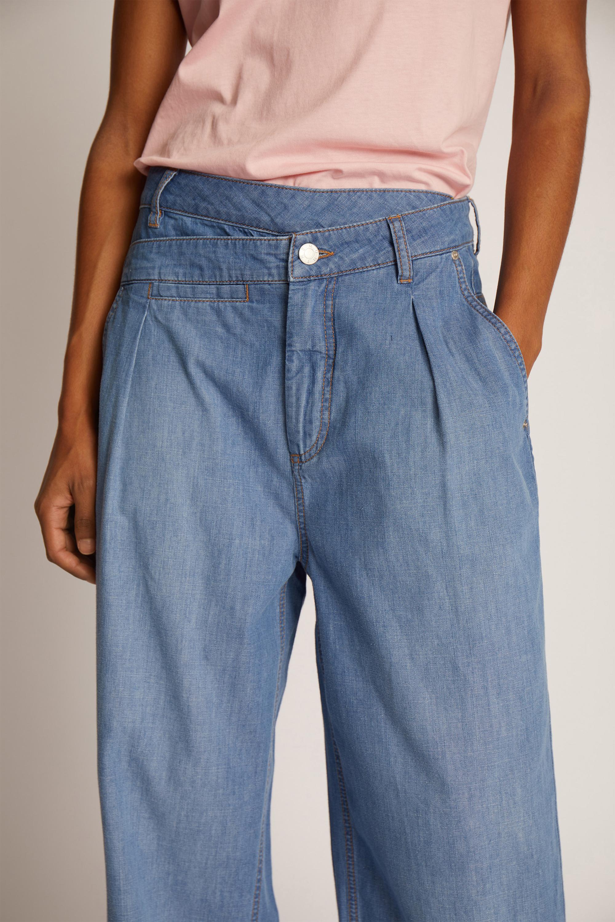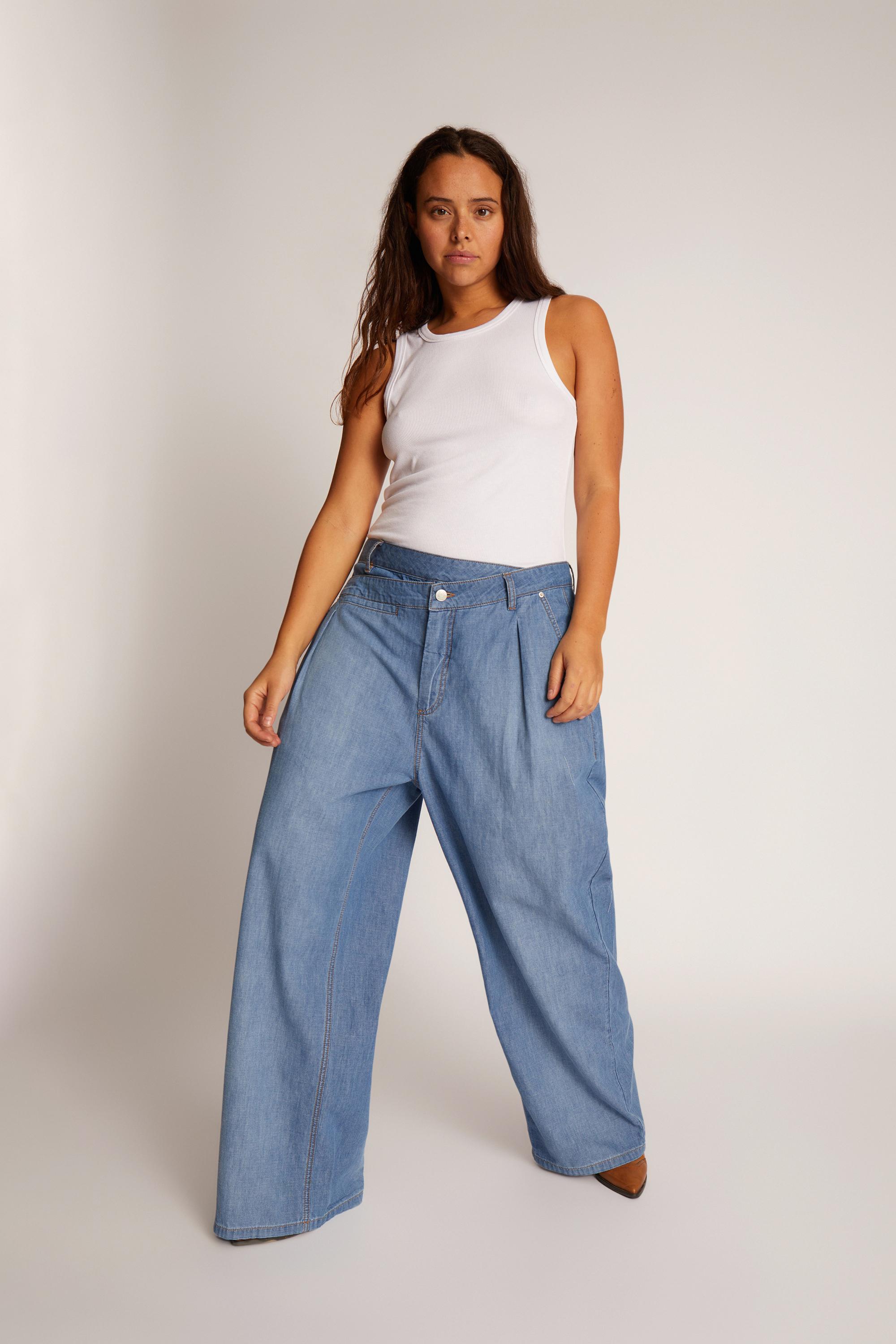 Hellblaue Denim-Hose mit weitem Bein und einem elegantem, doppeltem Bund. Diese Hose hat eine normale Passform, weite Beine und Seitliche Eingriffstaschen.