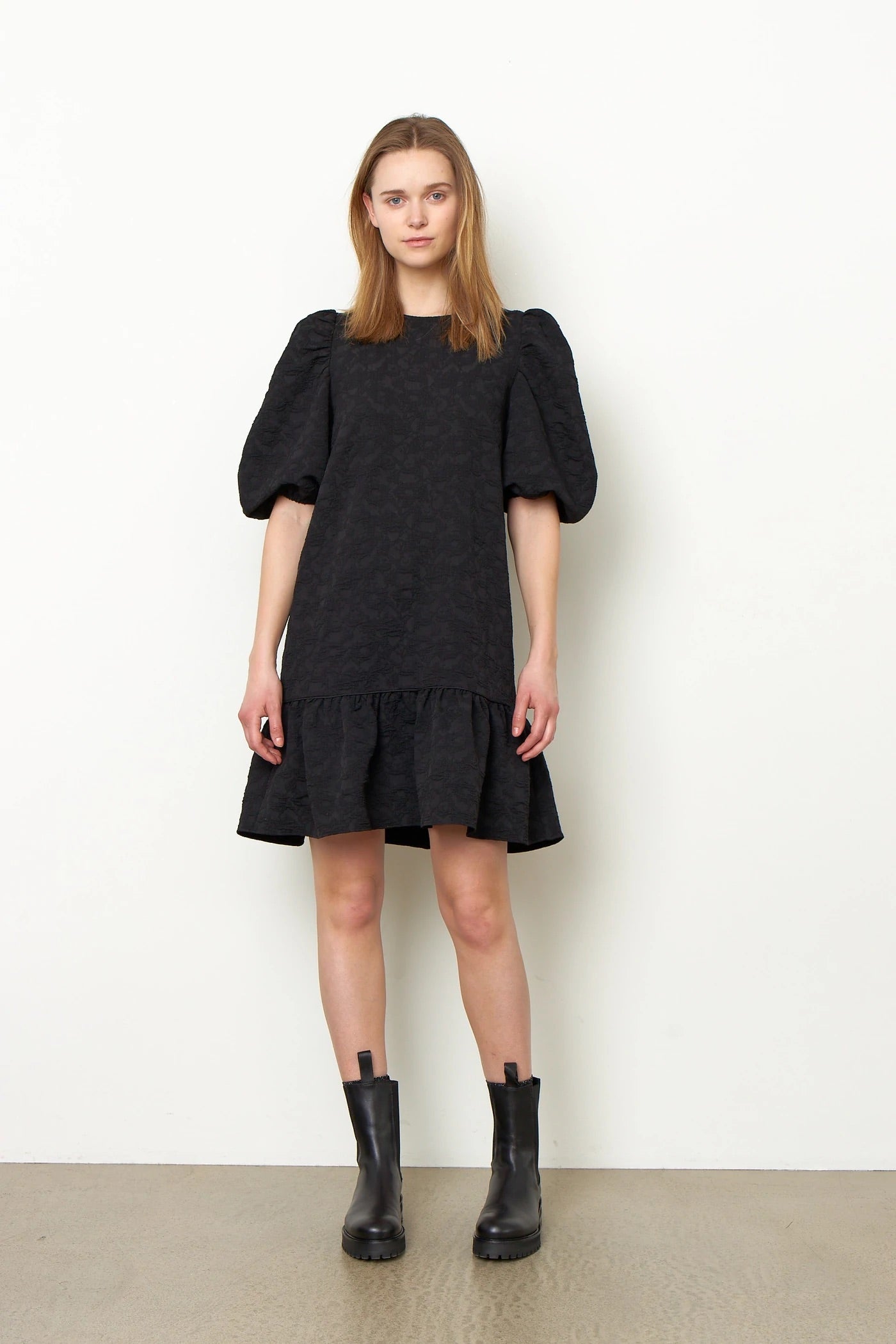 Kurzes Kleid Dorice vom dänischen Brand Second Female hat eine leicht ausgestellte A-Linie. Die Ware hat eine Struktur, wodurch das Muster etwas erhabener ist. Modisch durch dien Puffärmel und Falten am Saum. Durch den Gummizug am Ärmel kann man die Länge des Puffarms gut selbst festlegen. In Schwarz.