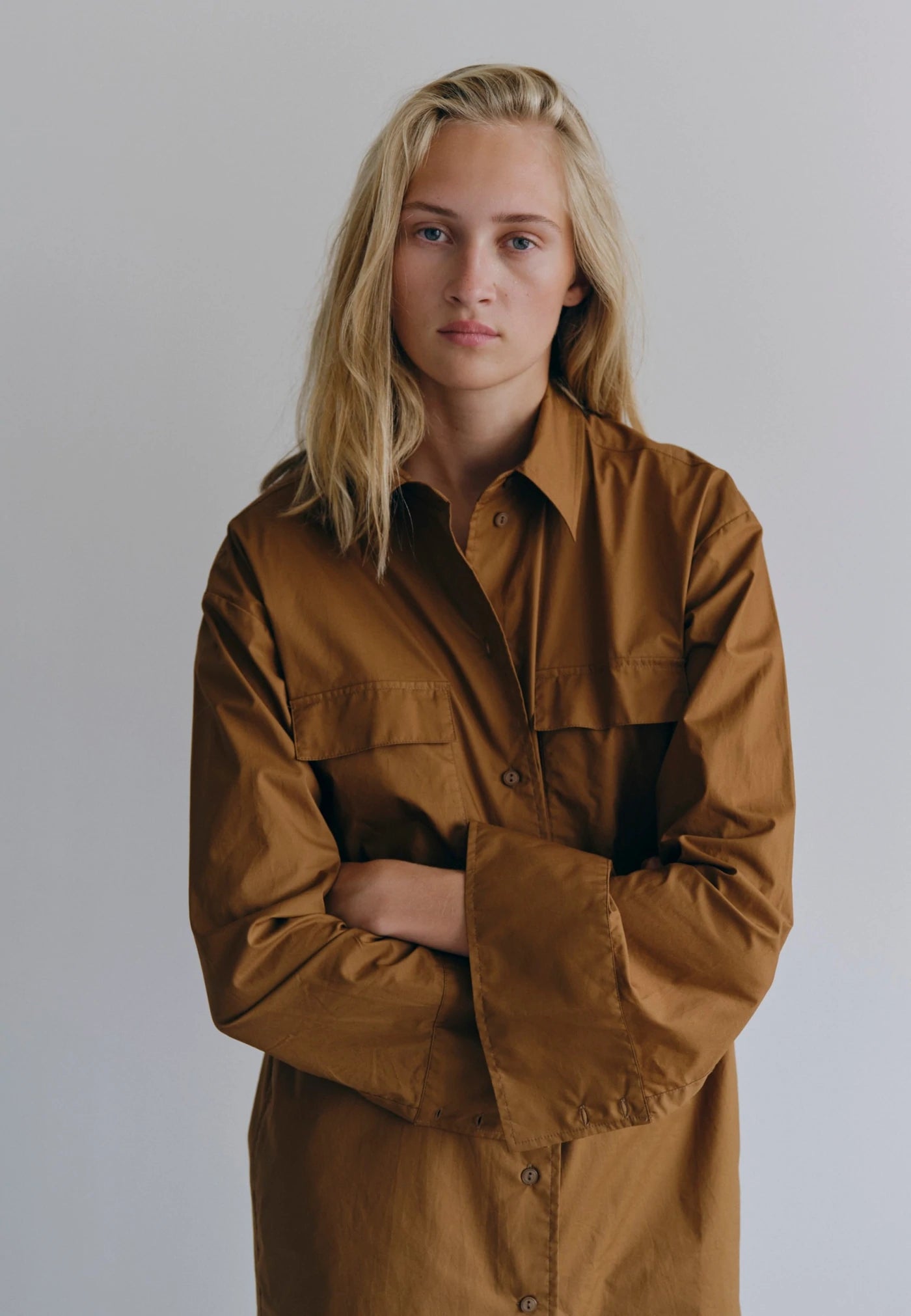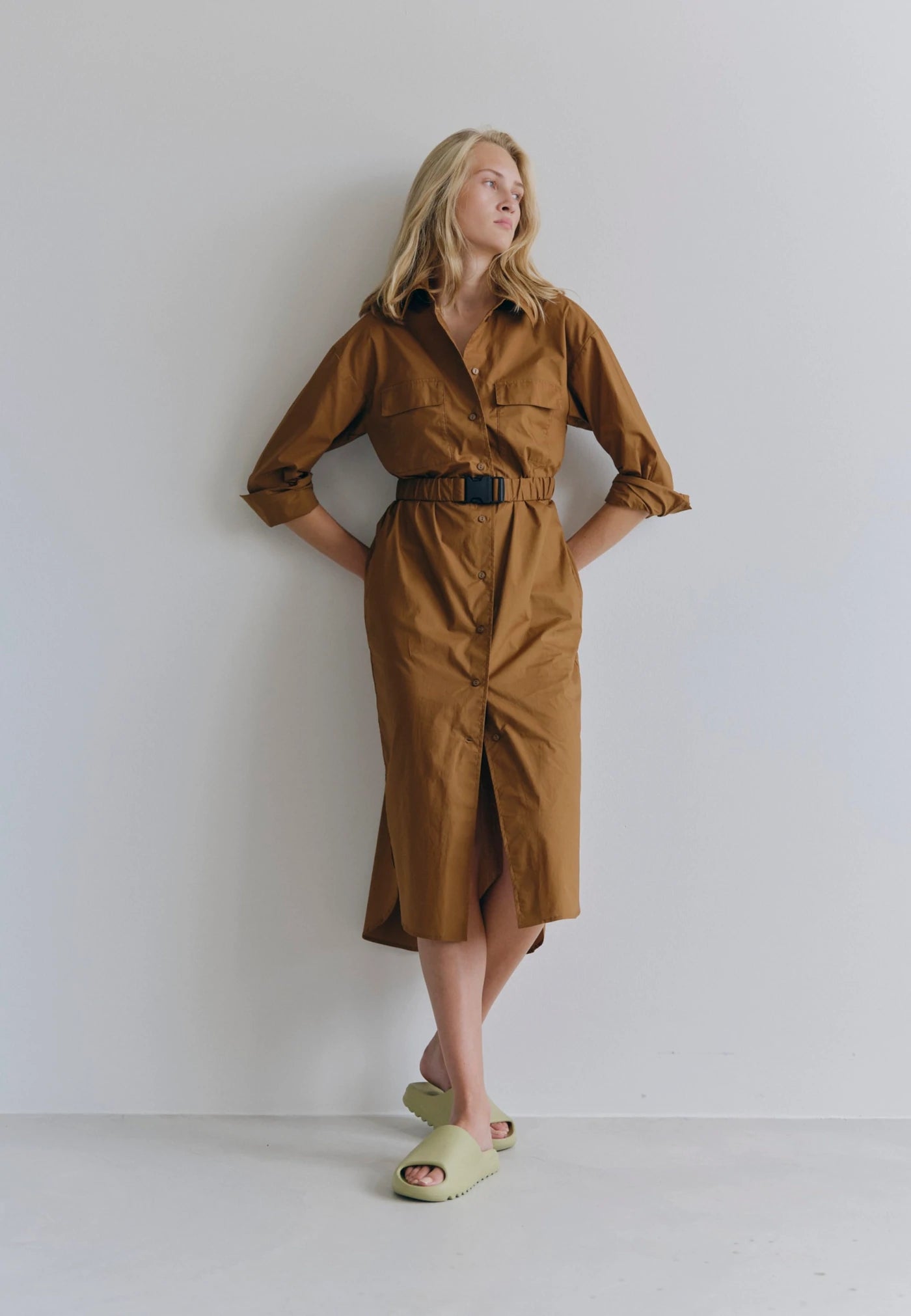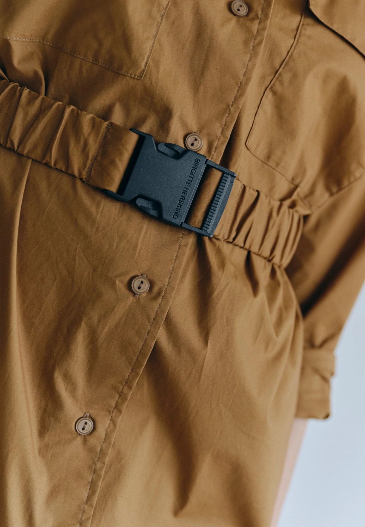 Langes und leichtes Hemd-Blusenkleid in Farbe Tabacco von Birgitte Herskind. Aus Bio-Baumwolle. Vorne komplett durchgeknöpft. Abnehmbarer Elastischer Gürtel aus dem Oberstoff und mit einer sportlichen Schließe. Für Lässigen Scandi Look einfach  eine schwarze Jeans kombinieren. Perfekt aber auch zum Strand über dein Bikini.