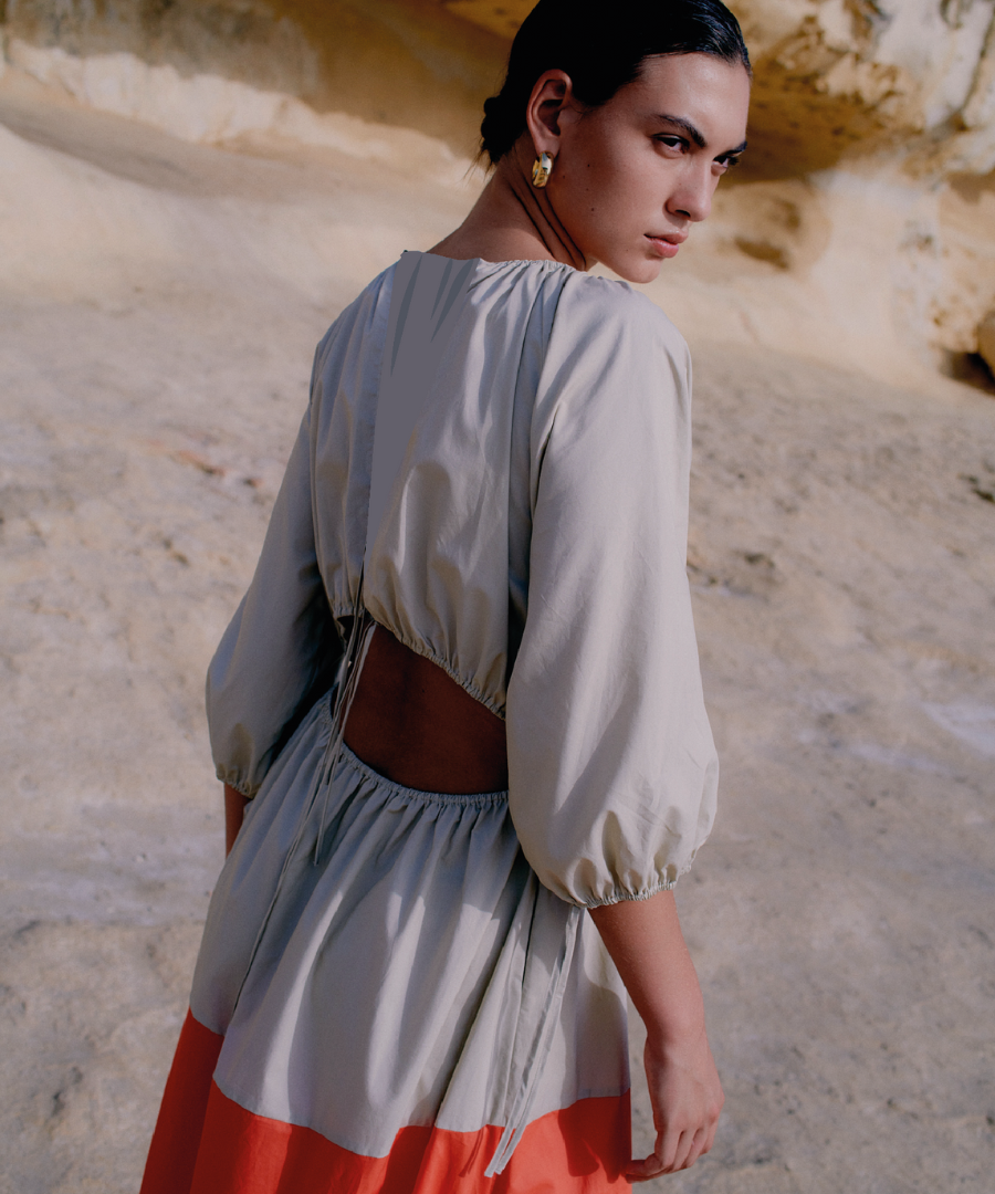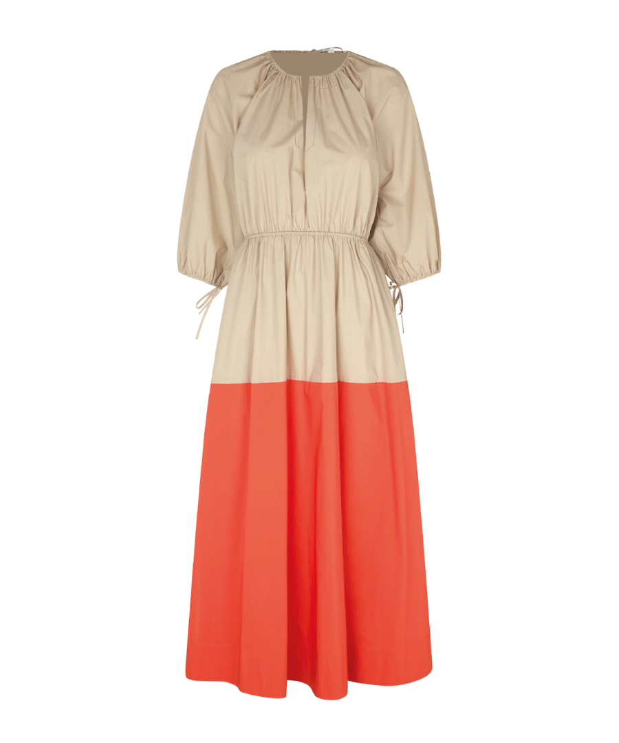La Dolce Vita! Kleid Dagny besticht durch die Farbkombination von Sand und Koralle. Das Kleid aus einer leichten Organic Cotton Qualität ist das perfekte Sommer und Urlaubskleid. Weite 3/4 Ärmel, mit Gummibund unten. V-ähnlicher Ausschnitt und elastische Taille ermöglichen ein sehr einfaches "Reinschlupfen" in das Kleid. Raffiniert im Rücken durch den Cut Out. Eingriffstaschen und seitliche Schlitze am Saum.