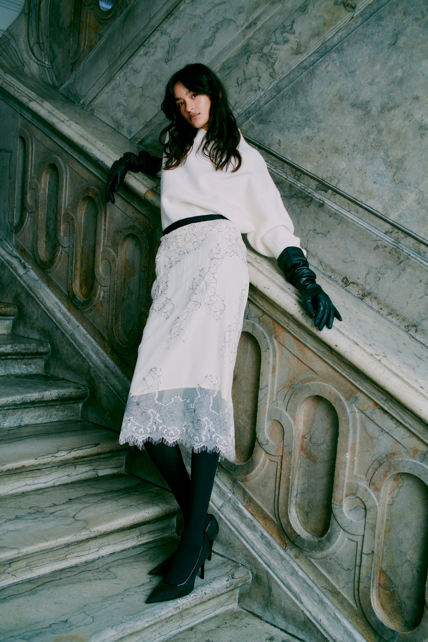 Second Female transparenter elastischer Rock aus heller Spitze. Der Rock ist aus sehr leichter Spitze mit Kontrast-Stitching. Die Spitze am Rock ist unterlegt, der Bund ist elastisch, in Kontrastfarbe Schwarz. Der Rock hat einen verdeckten Reißverschluss im Rücken. Durch schwarzen Bund und Stitchings, ist der Rock gut kombinierbar zu schwarzen Schuhen, Strumpfhosen etc. Nicht nur im Winter ein tolles Wow-Piece, auch im Sommer mit Hemd, Bluse oder T-Shirt tragbar.