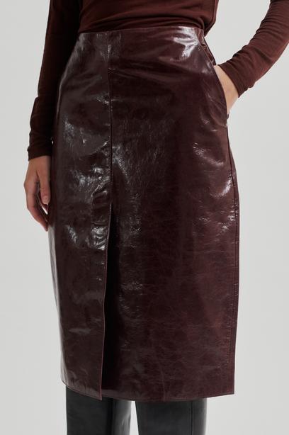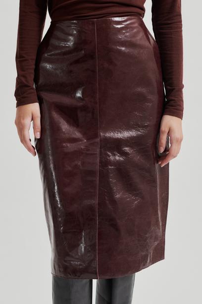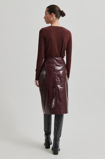 Lederrock in Farbe Bitter Chocolate von Second Female. Der Rock hat eine glänzende Leder Oberfläche was ihm eine tolle & besondere Optik verleiht. Bleistiftform, und ist bis zur Hälfte gefüttert. Mit Einem Schlitz vorne für bessere Bewegungsfreiheit. Mit Nahtreißverschluss hinten zum Schließen.