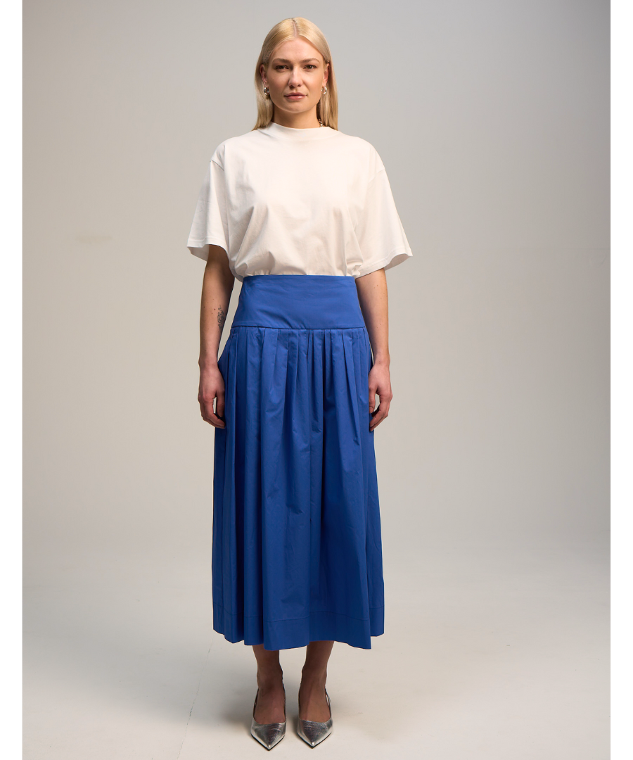 Ein Sommerrock in wunderschönem Blau, aus der Baumwoll-Qualität von der Italienischen Marke Solotre. Der Rock hat eine Passe und Falten die erst ab der Passe/ Teilungsnaht aufspringen. Dadurch bleibt es am Baum flach anliegend und die Falten tragen nicht auf. Seitliche Eingriffstaschen machen den Rock extrem lässig. Kombiniere den Rock sportiv mit einem T-Shirt oder Cool & Elegant mit einer Bluse oder Top.