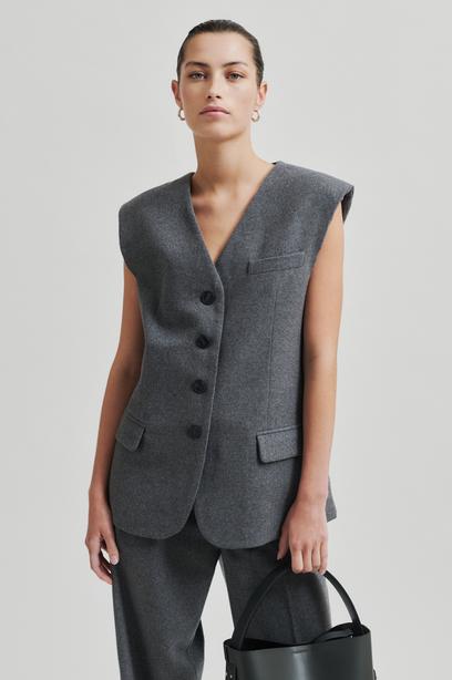 Durchgeknöpfte lange Weste von Second Female. Die Weste aus der soften wool-mix Qualität. Komplett gefüttert und mit V-Neck Ausschnitt. Verstärkte Schulterpartie für die angesagte Sanduhr- Silhouette.