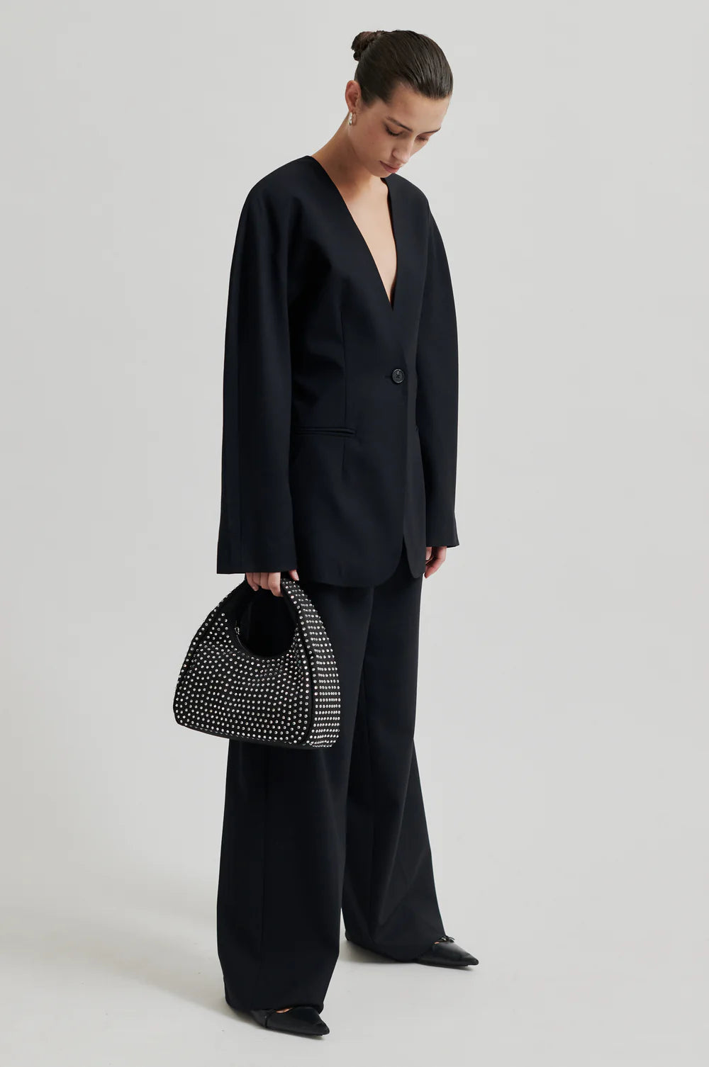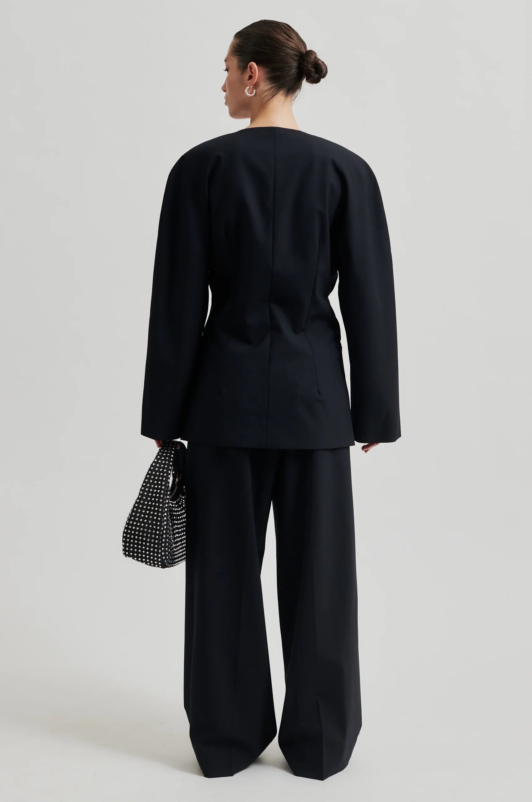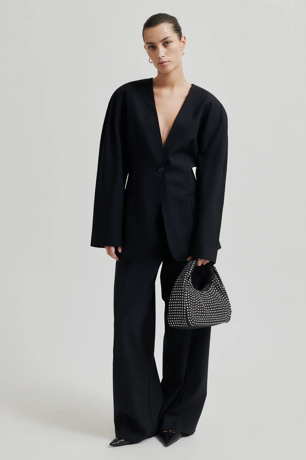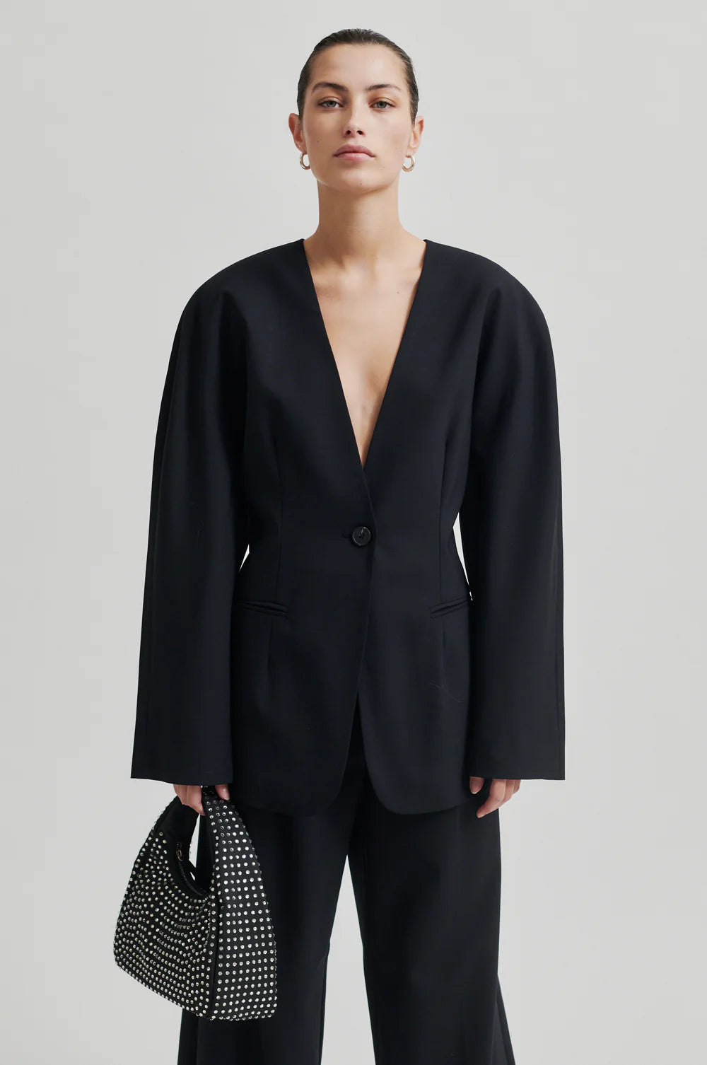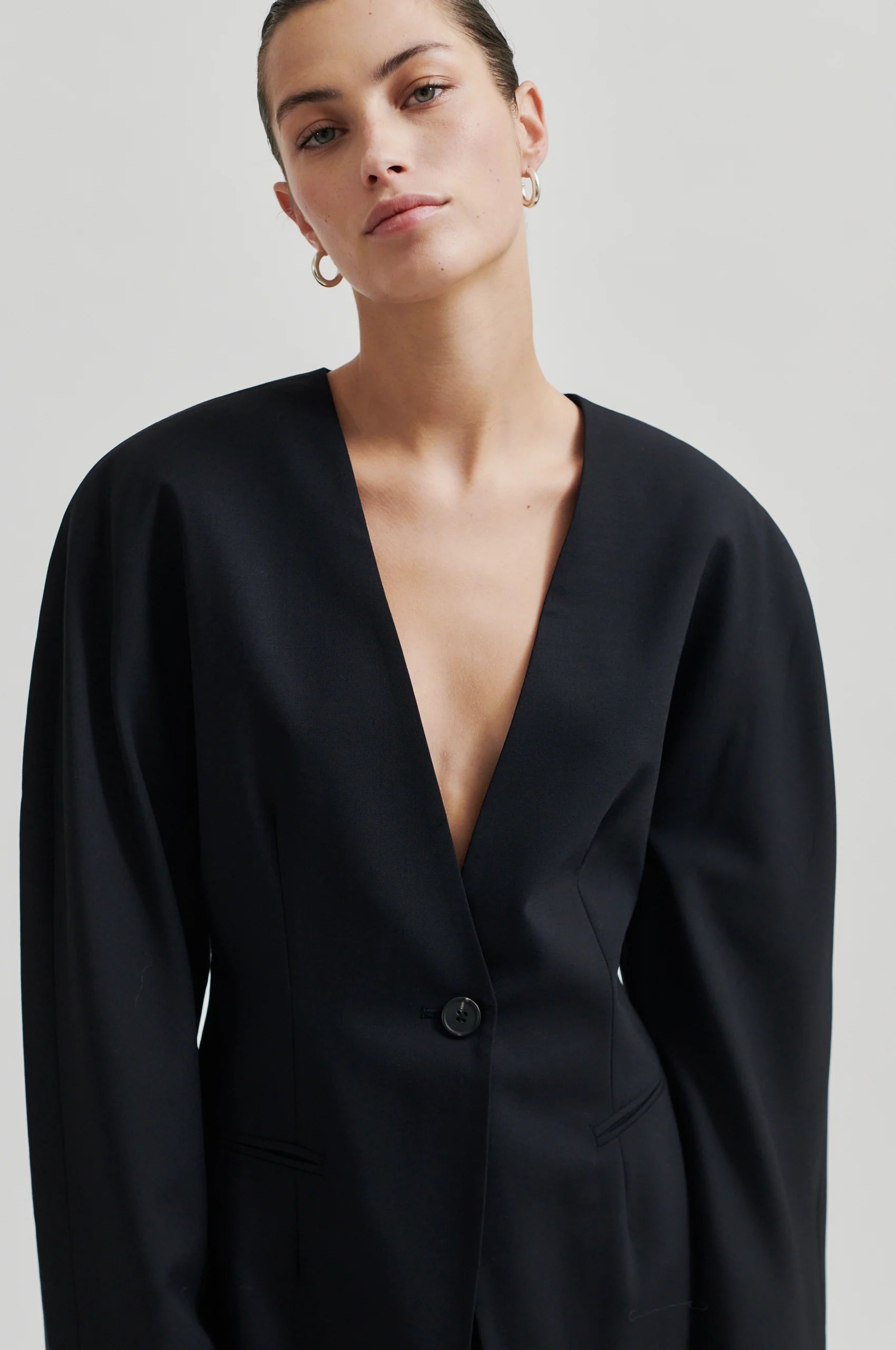 V-Ausschnitt Blazer von Second Female ohne Revers. Dieser Blazer hat eine besondere Sanduhr-Silhouette. Aus einer sehr leichter Wollmix-Qualität. Ausschnitt in V-Form und vorne mit Knopf zum Schließen. Besonderes Design mit einer verstärkten Schulterpartie die ohne eine Schulternaht auskommt. Paspel-Taschen vorne. Komplett gefüttert.