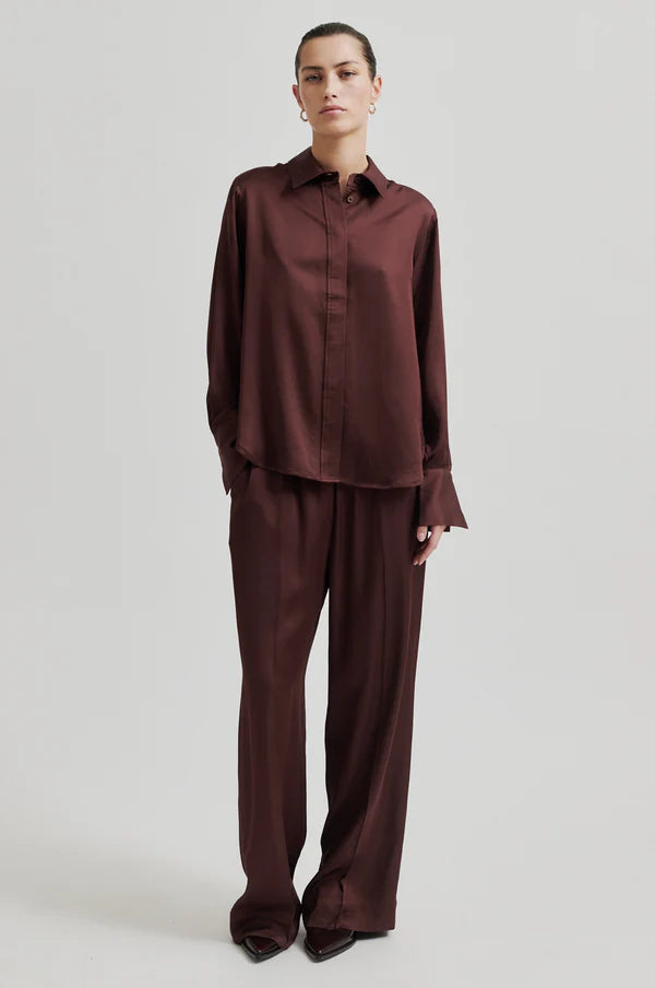 Second Female Hose aus einer glänzender Viskose Satin Qualität.  Mit einem elastischen Bund und seitlichen Eingriffs-Hosentaschen versehen. Regular Taillenhöhe, gerader Beinverlauf.