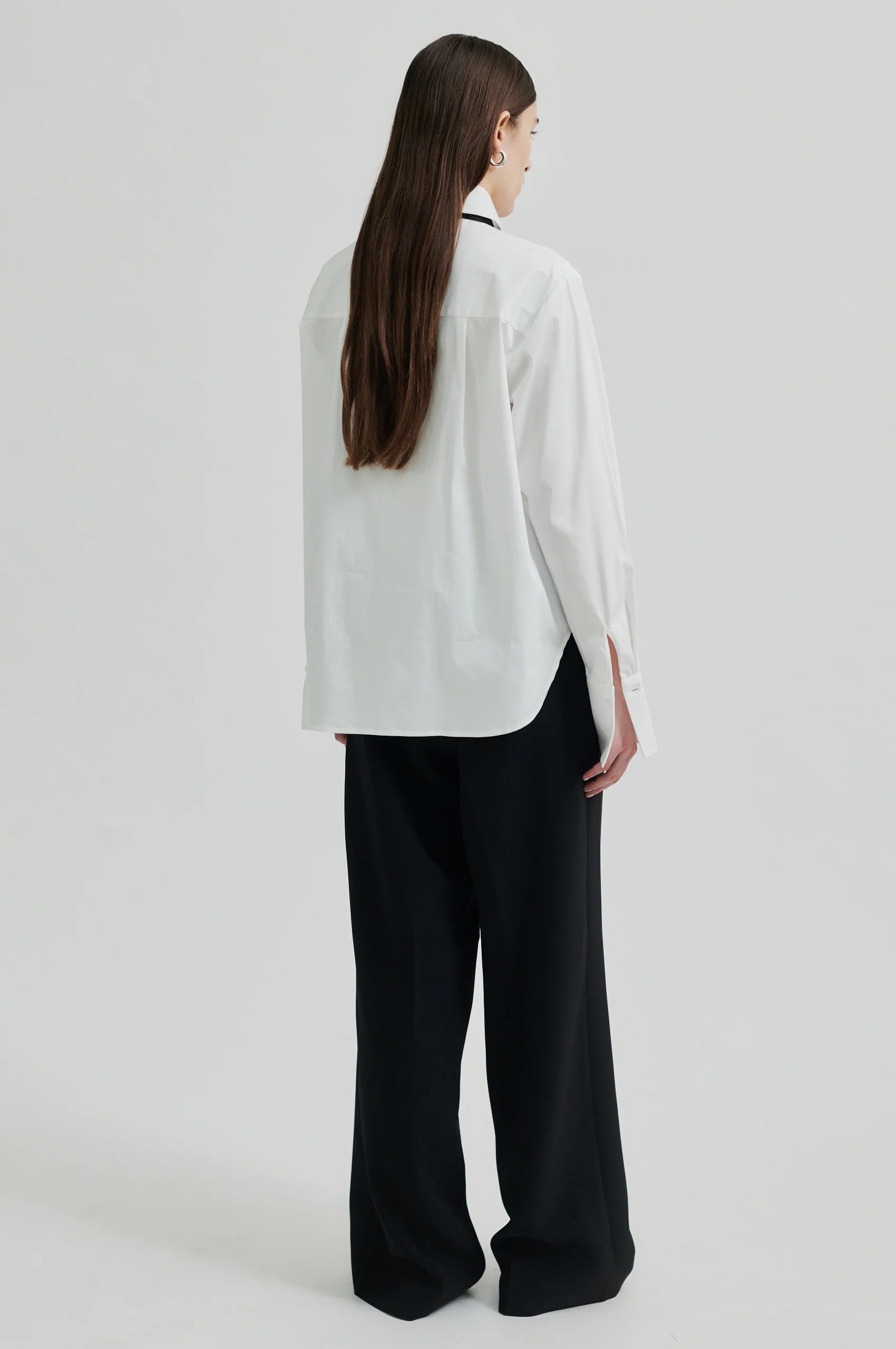 Zwei in einem: eine tolle klassische Bluse in Weiß für jeden Tag oder für den Abend mit der kontrastigen Satin-Schleife. Die Bluse ist aus einer leichten Baumwoll-Qualität mit klassischem Kragen und hoher Manschette. Das schwarze Band/ Schleife ist hinten fixiert mit einem Knopf und kann je nach Styling entfernt werden.