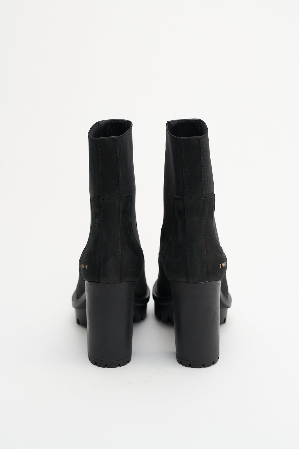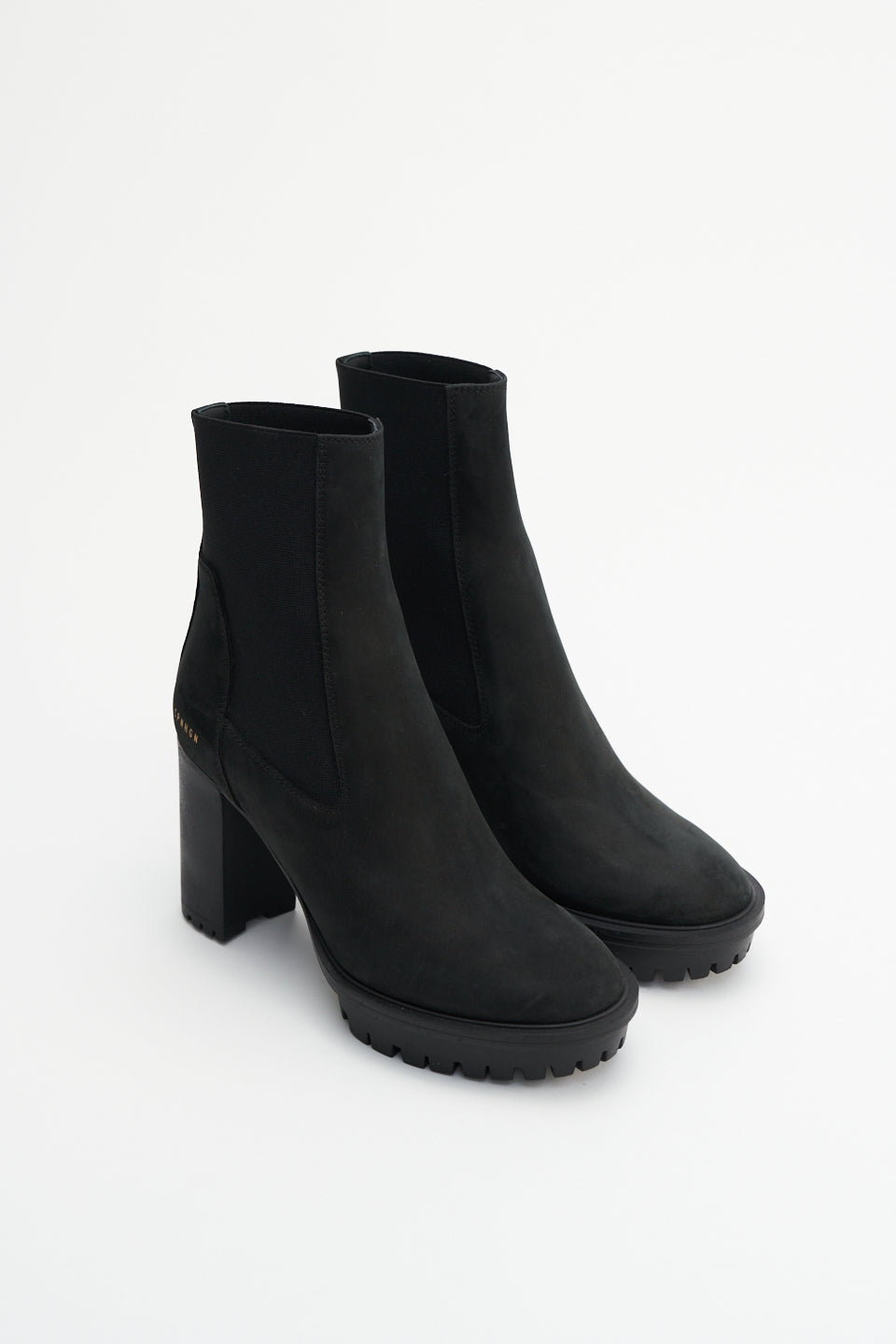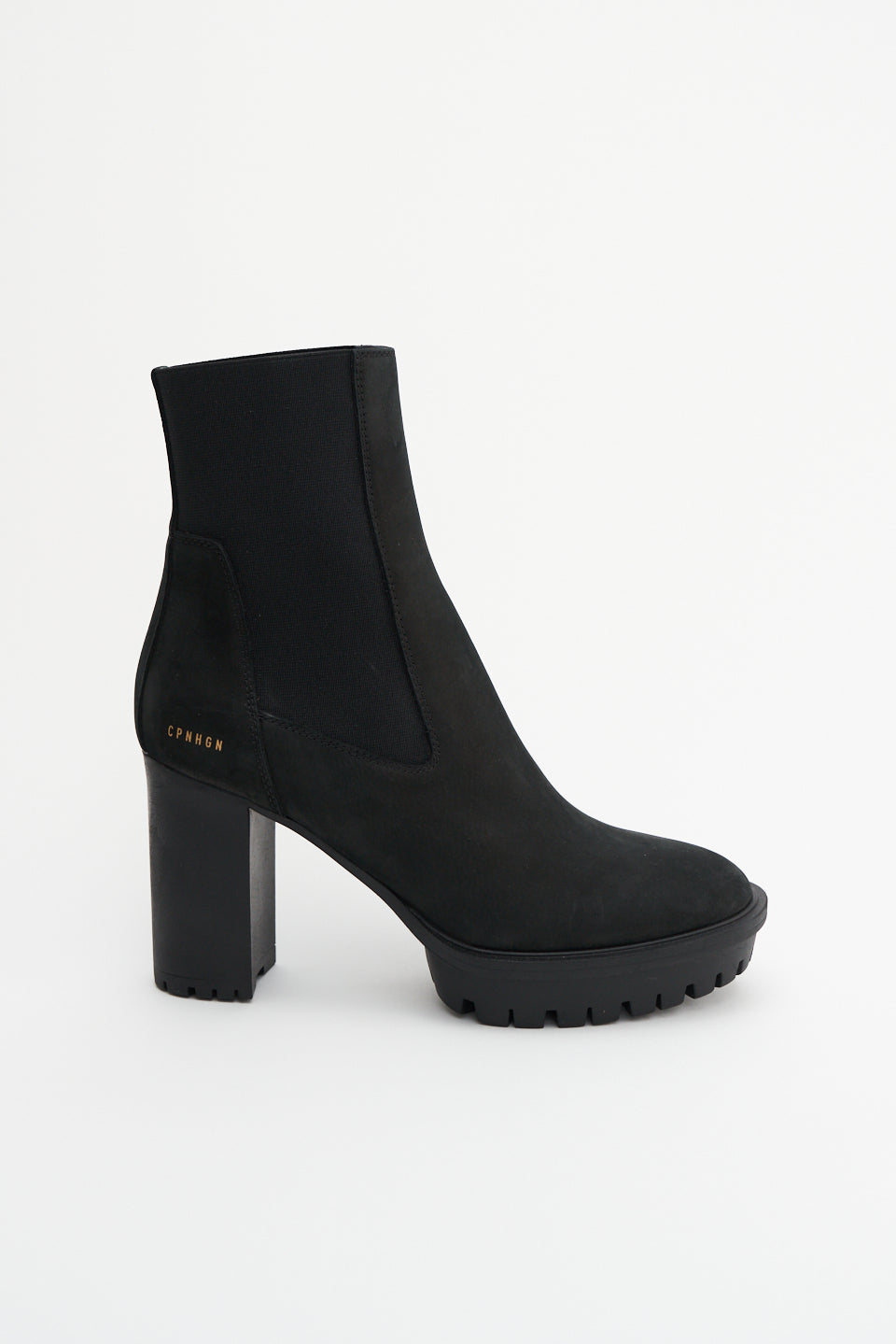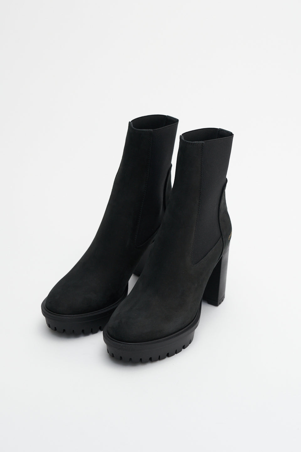 Chelsea Boots mit Absatz aus Nubukleder. Anliegender Schaft mit elastischen Einsätzen, was das bequeme "rein schlupfen" in den Schuh ermöglicht. Klassiker im neuen Look, in schwarz.  Kombiniere diesen Schuh zu der verkürzten Jeans, Leggins oder zum Kleid. Perfekt wenn der Look eleganter gestaltet werden soll.  Plateau Sohle aus Gummi mit Profil. Innenfutter aus Leder.