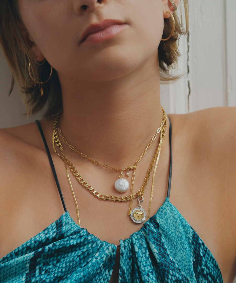 Kette Karen von Maria Black eignet sich perfekt dazu um einen Layering Look zu stylen, versuche diese Kette mit mehreren anderen Ketten zu kombinieren.