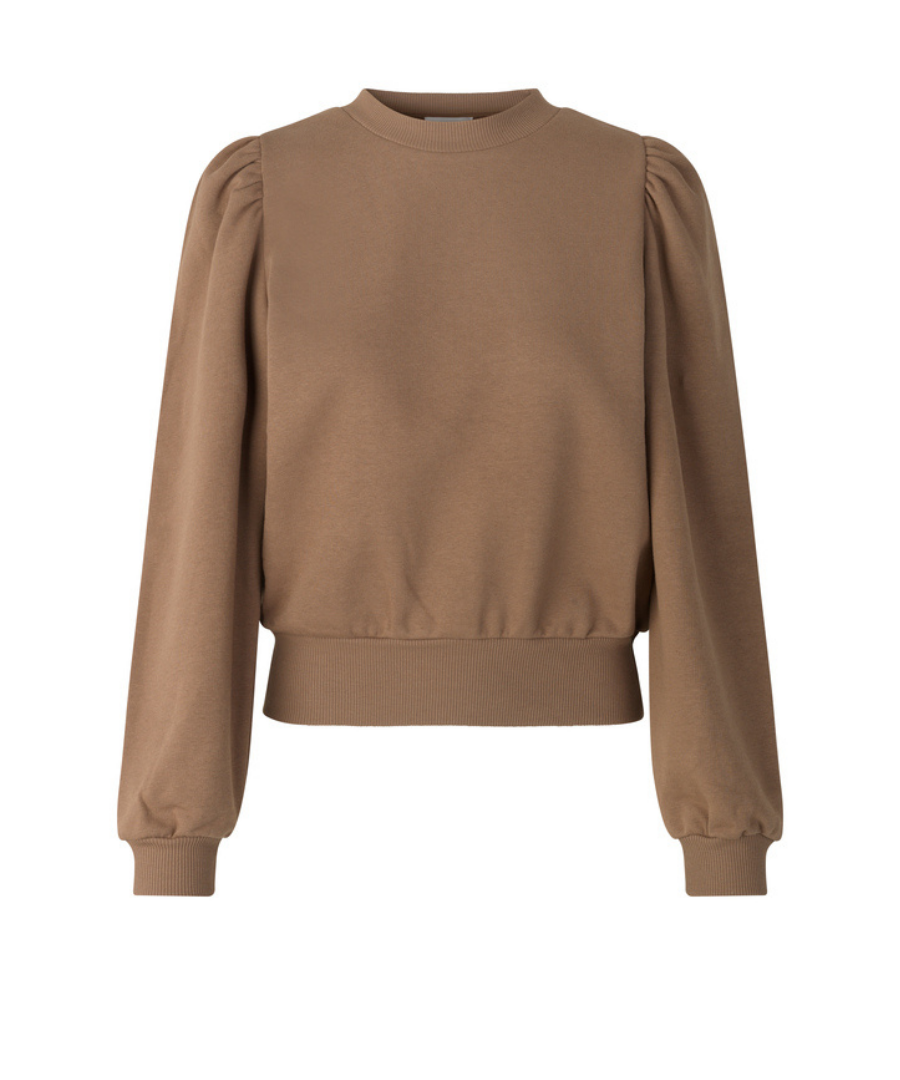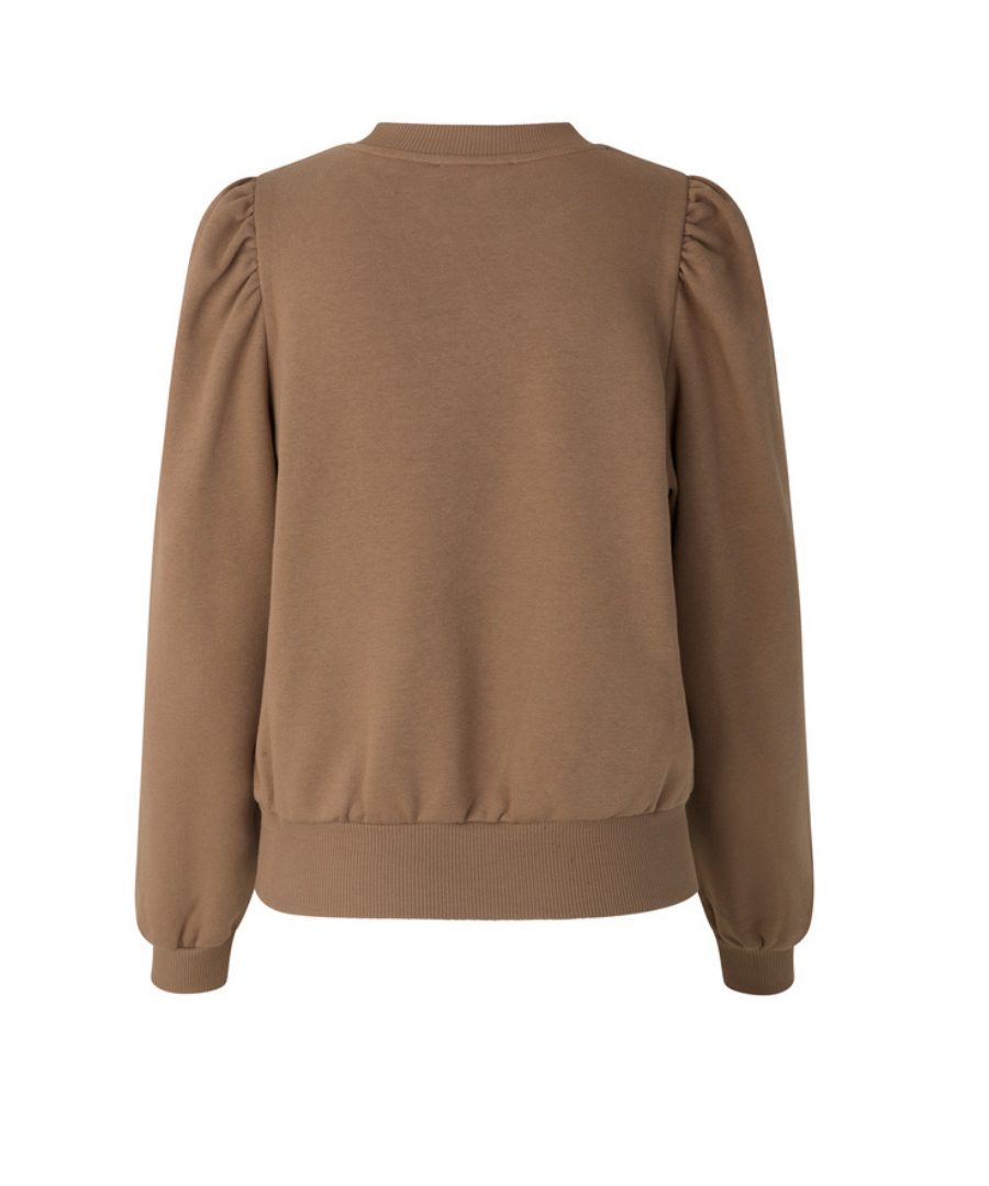 Carmella Sweatshirt mit Raffung in softer Baumwoll-Mix Qualität. Das Sweatshirt hat die für Sweat Oberteile typischen Bündchen am Arm und Saum und ist unglaublich angenehm auf der Haut. Dieses Model ist mit Raffung an der Schulter versehen und in Farbe Otter. Perfekt geeignet für die kühleren Tage. Dieses Sweatshirt kann auch mit Carmela Hose in Whisper White kombiniert werden.