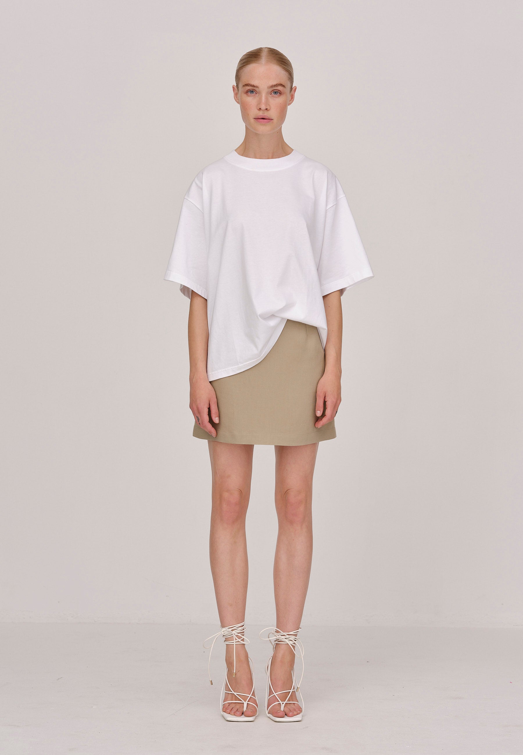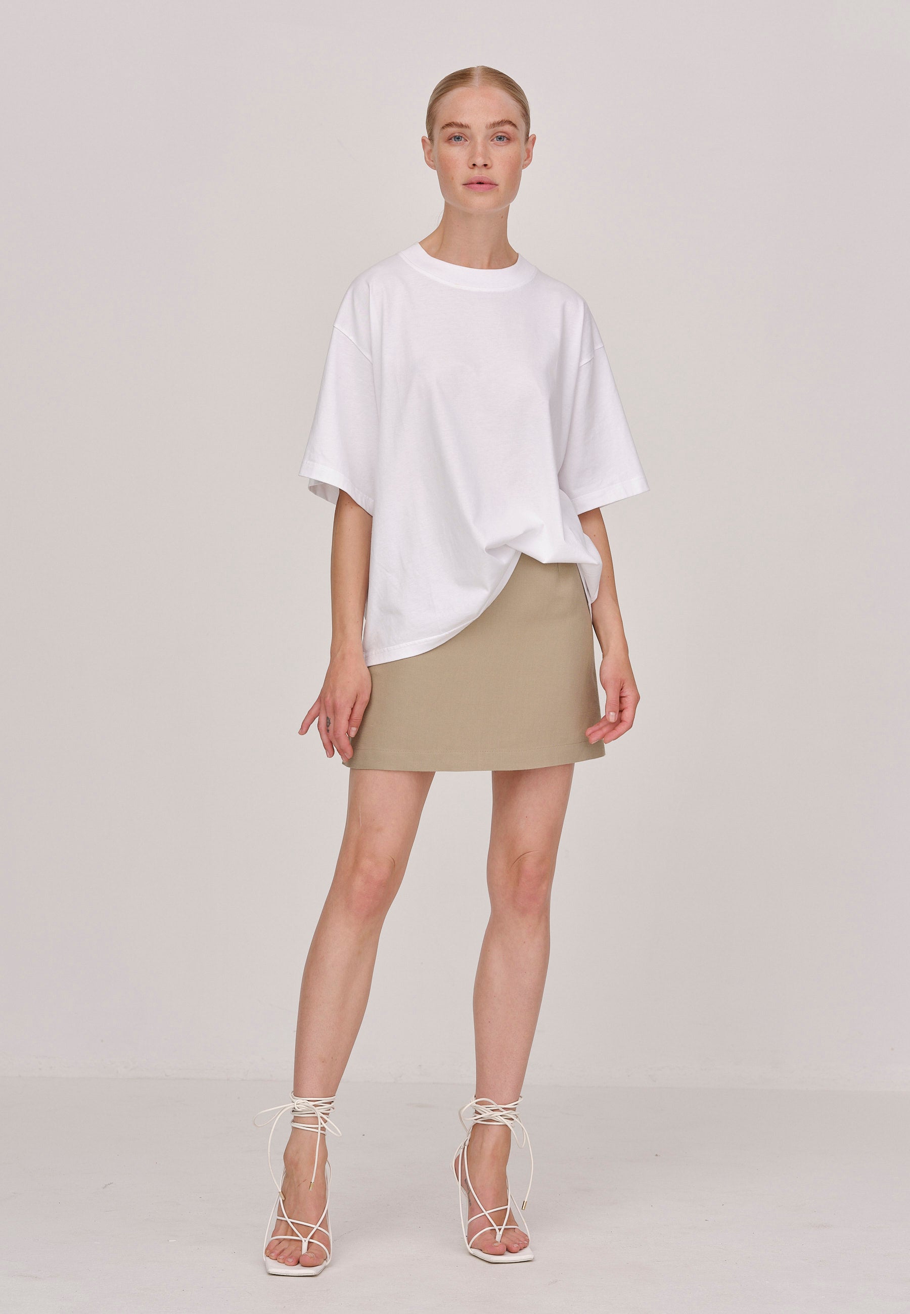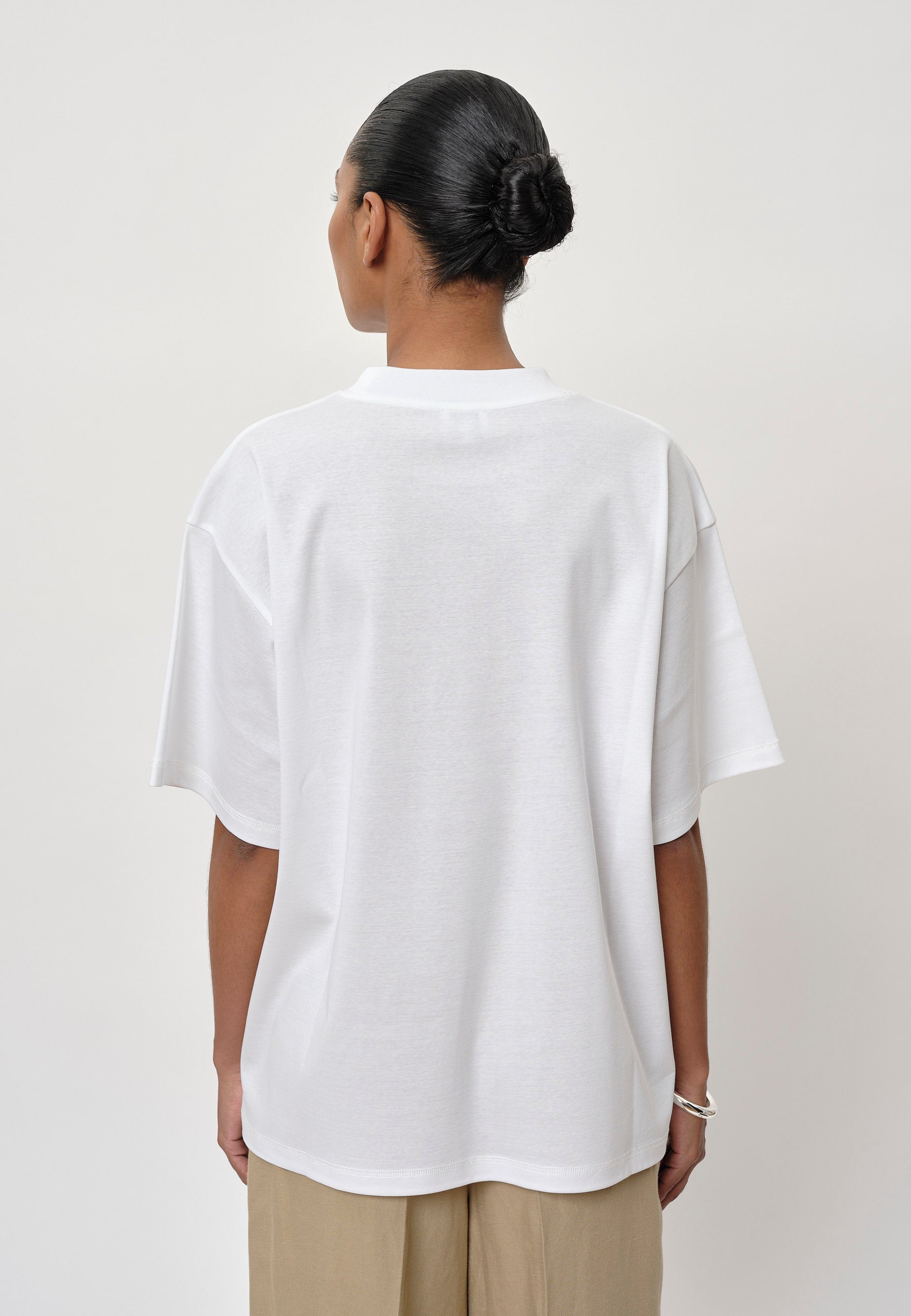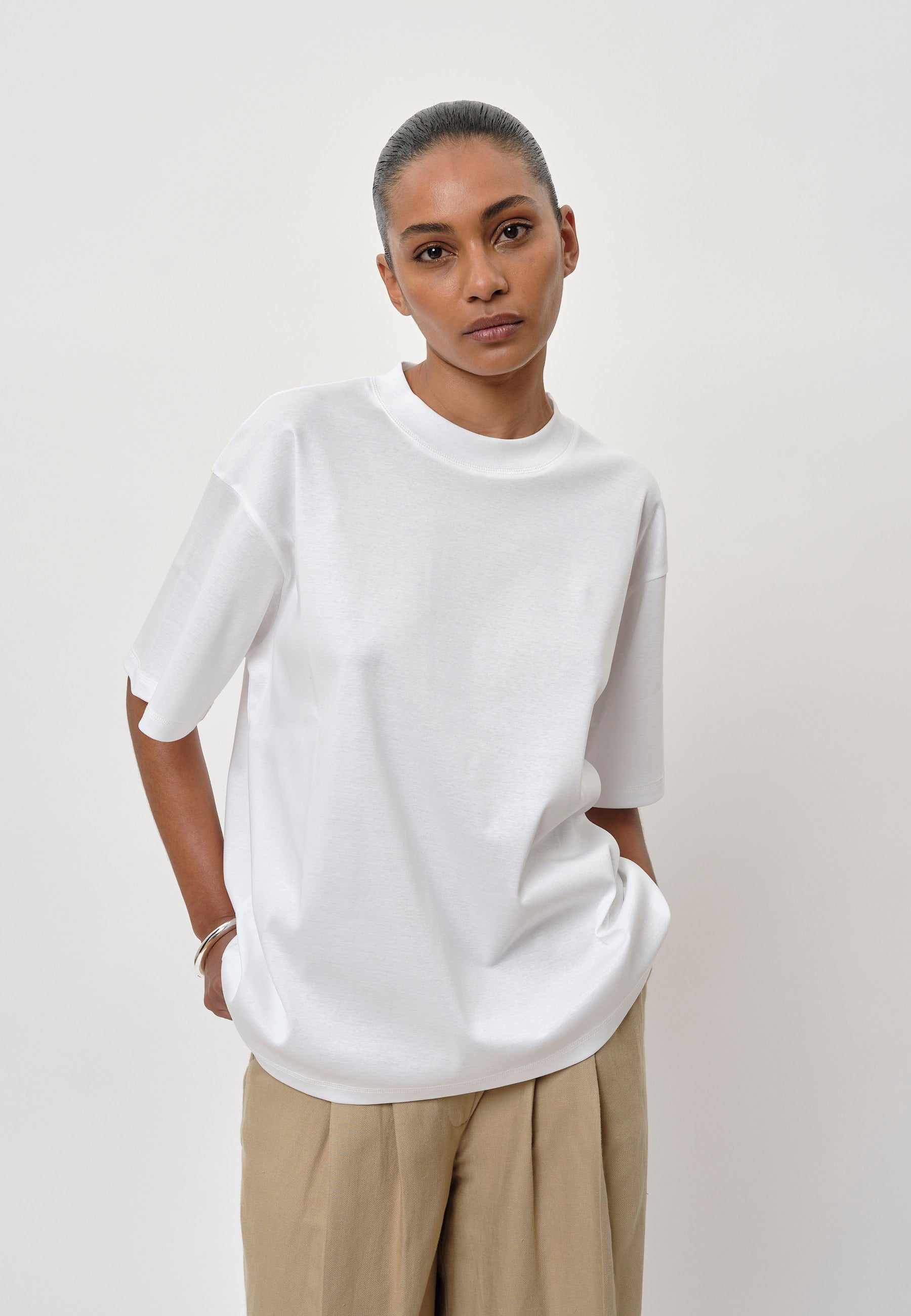 Super softes und blickdichtes T-Shirt Larsson von Premium Marke Herskind aus Dänemark. Es ist ein oversized Halbarm T-shirt in Farbe Weiß. The model is 178 cm and wears a size 36.