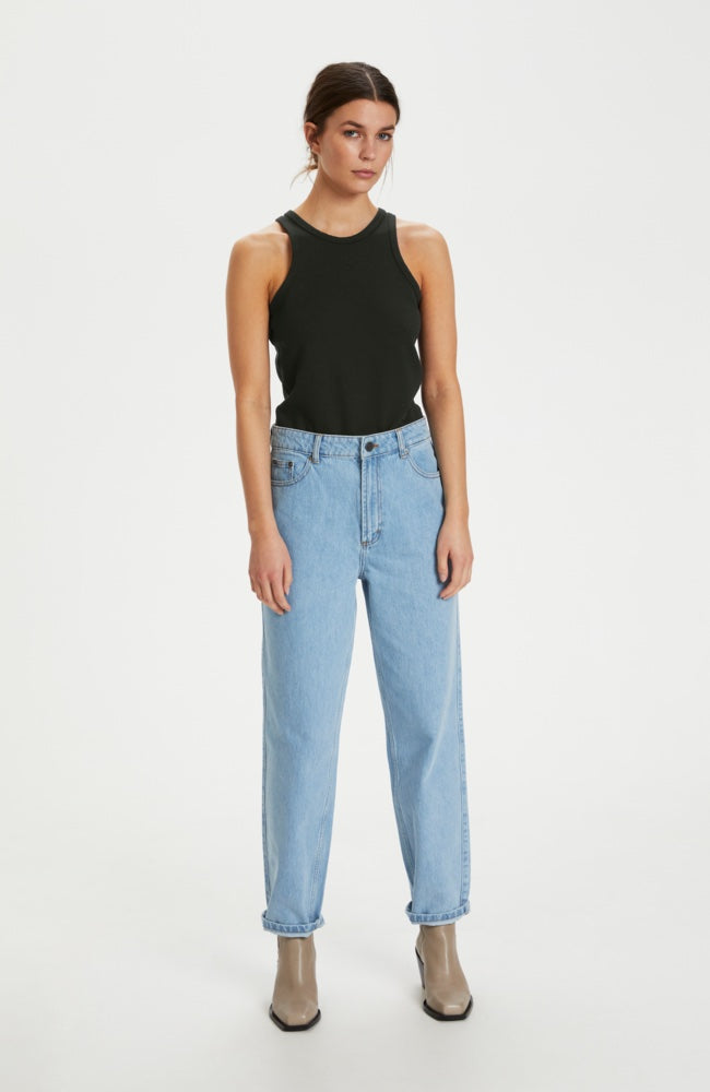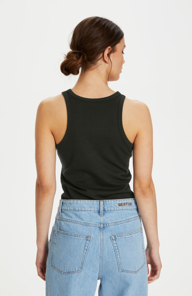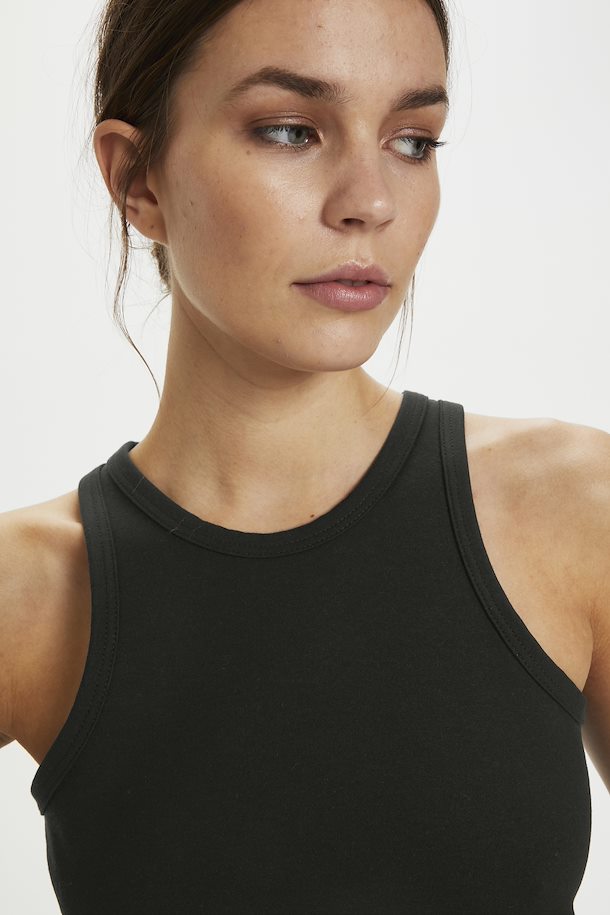 Tank Top aus Lyocell von Gestuz. Die Ware ist kompakter zum Vergleich der normalen Ripp Tank Tops. Lyocell hat eine glattere Oberfläche und atmungsaktive Eigenschaft. Auch im Vergleich zur Baumwolle ist Lyocell eine gute nachhaltige Alternative, da bei der Verarbeitung weniger Wasser gebraucht wird.