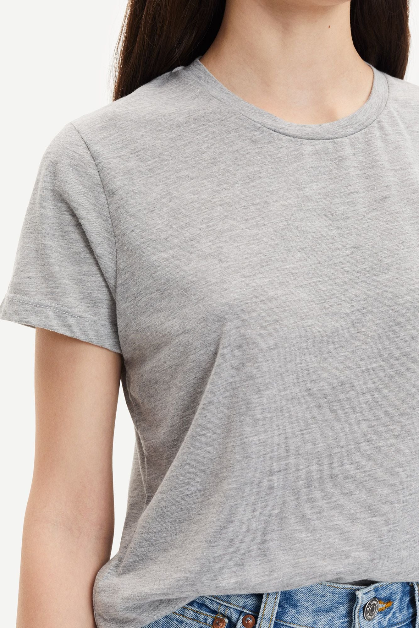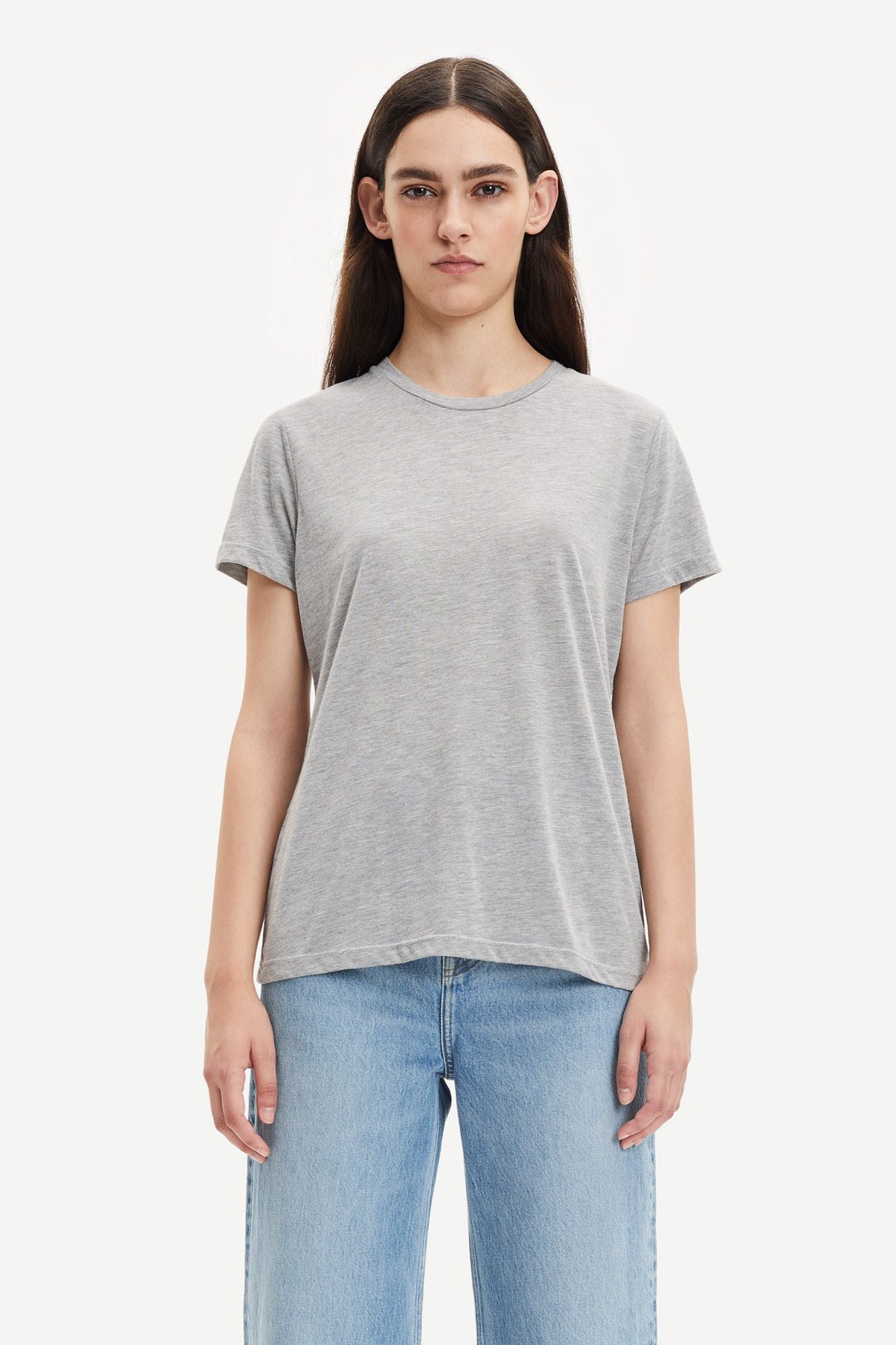 Solly basic T-Shirt von Samsoe Samsoe ist produziert aus 100% organic cotton. In Grau Melange. Feine leichte Qualität, sehr angenehme auf der Haut. Perfektes Must-Have Basic Teil, welches im keinen Kleiderschrank fehlen darf. Kombiniere am besten zum schwarzen Blazer und einer Jeans.
