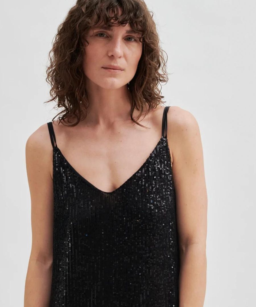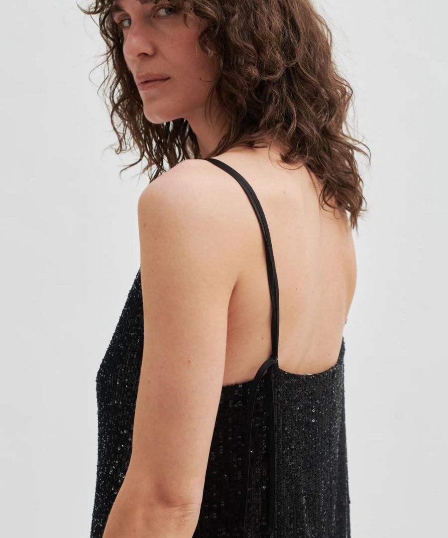 Schwarzes Pailletten Top mit Spaghetti Trägern, unterfüttert mit Mesh Qualität. Leichte Qualität, locker geschnitten. Kombiniere am Besten unter einem Blazer oder zum Strick. Für besondere Anlässe ob im Winter oder Sommer perfekter Kombiartikel.
