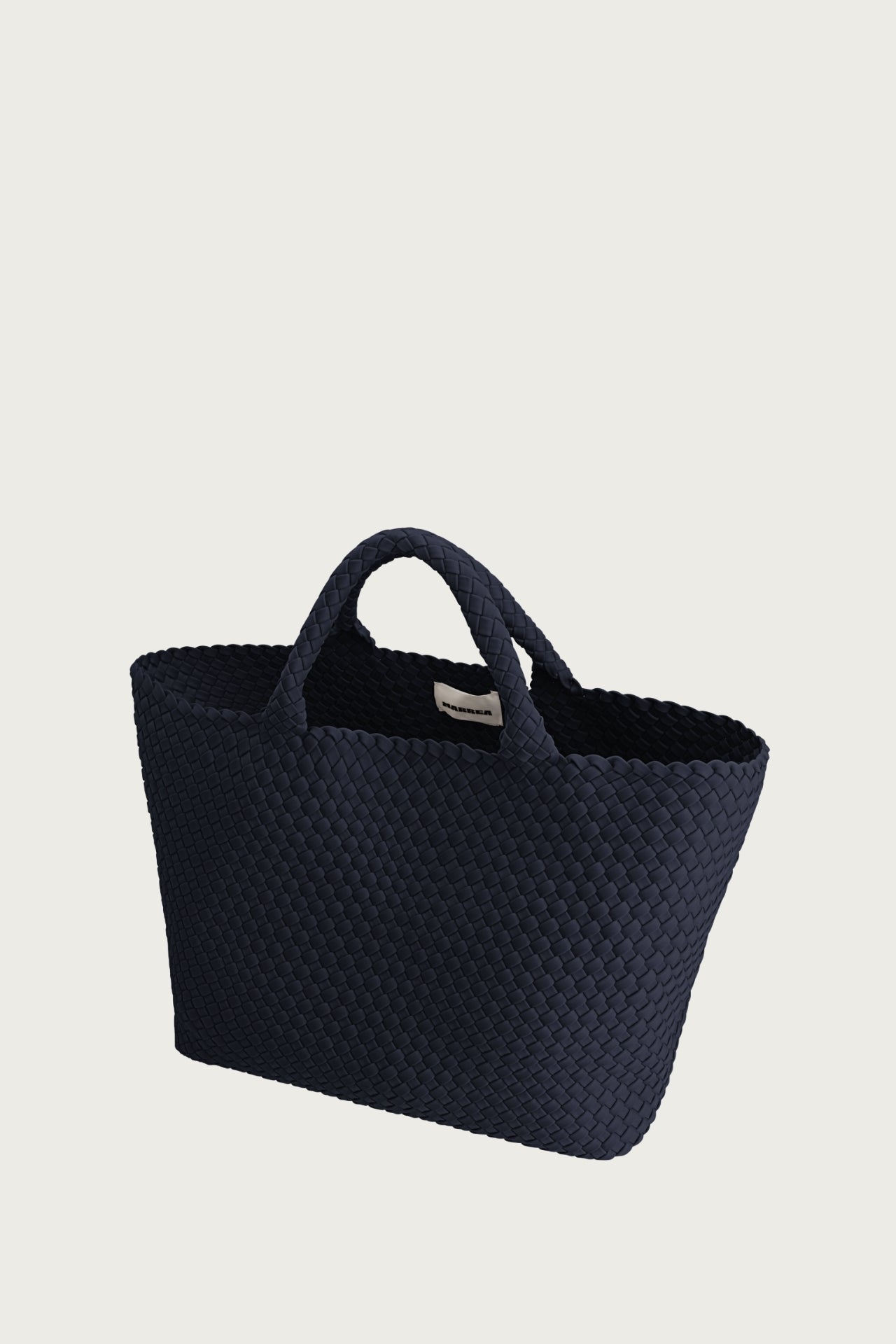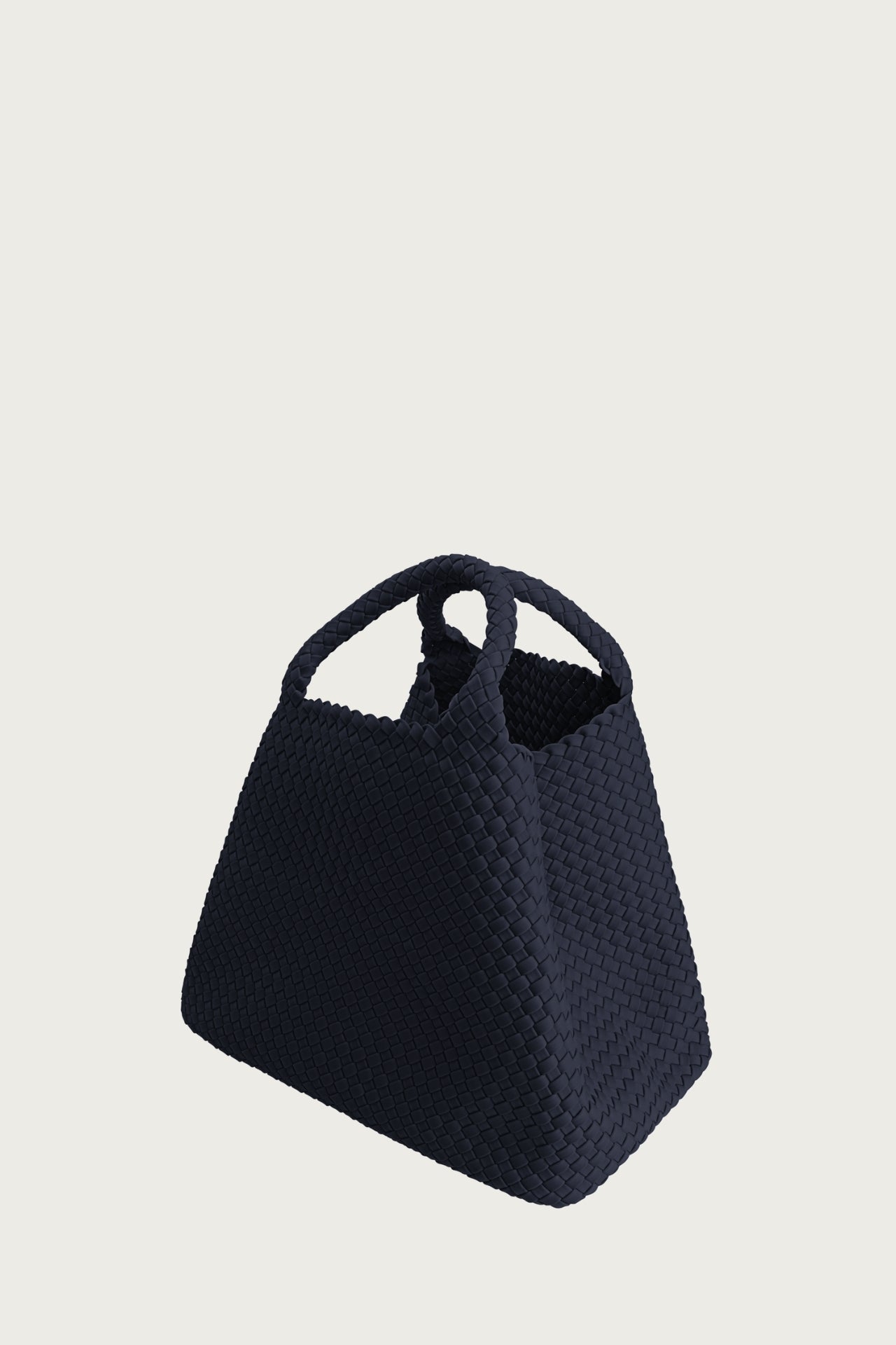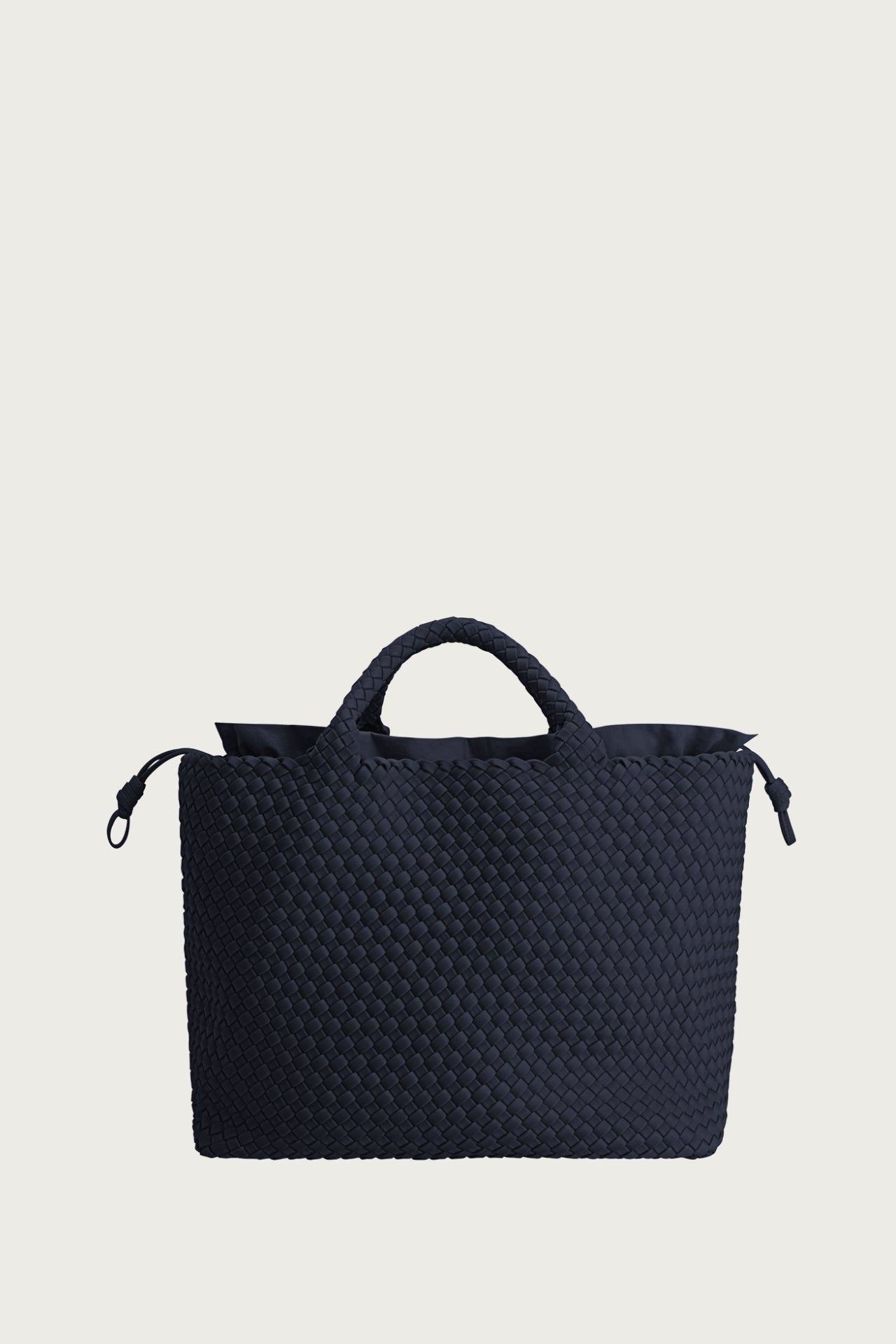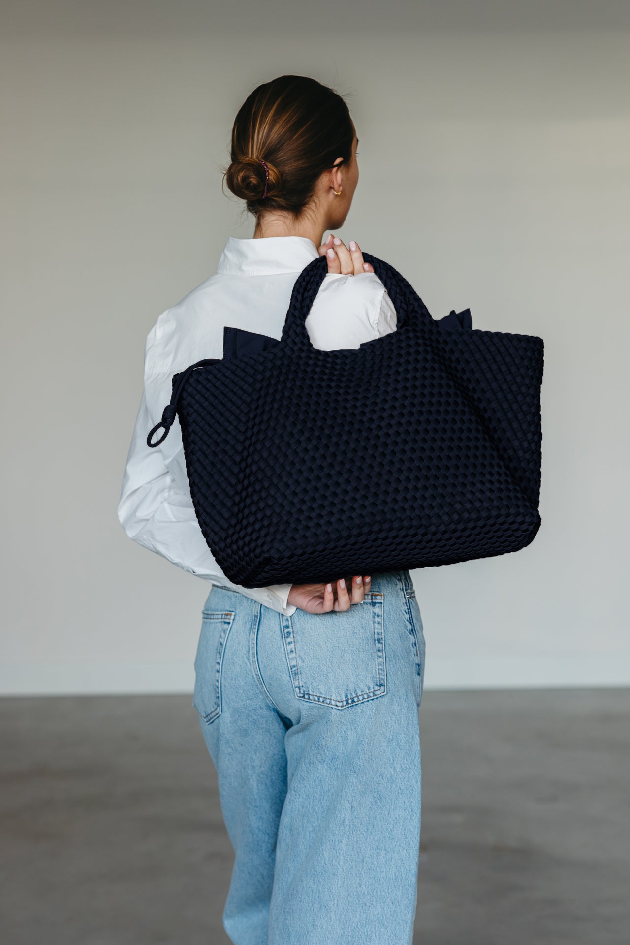 Diese Tasche ist ein Must-have für alle, die auffallen wollen. Ob Fitnessstudio, Strandtag oder Wochenendtrip: Diese geräumige Tasche ist ein perfekter Begleiter für Alle Gelegenheiten. Farbe Almost Midnight ist ein dunkler Marine-Farbton mit urbaner Eleganz. Tasche ist von Hand geflochten aus Neopren & passt zu jeder Jahreszeit, jedem Look, jeder Stimmung. Mit zwei Hänkel versehen, so kannst du sie in der Hand, am Ellbogen oder auf der Schulter tragen. Die Taschen kann leichte vom Schmutz abgewaschen werden und inkludiert ein Wasser-resistentes Innenbeutel. Maße 30cm x 50 cm x 22 cm